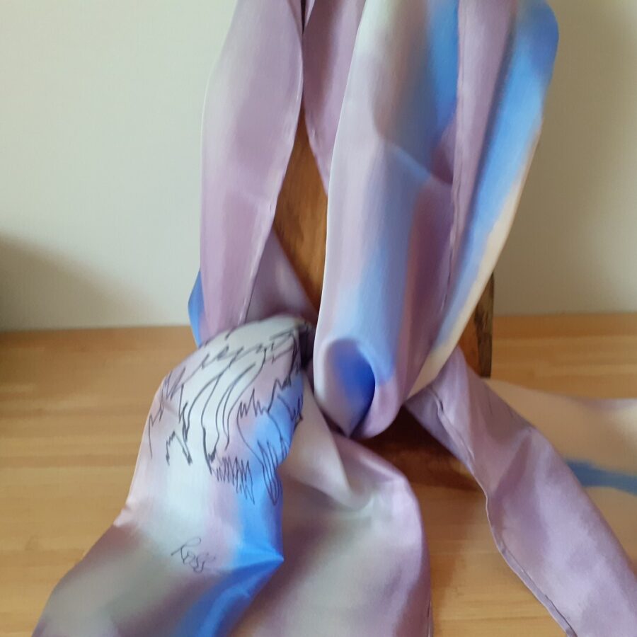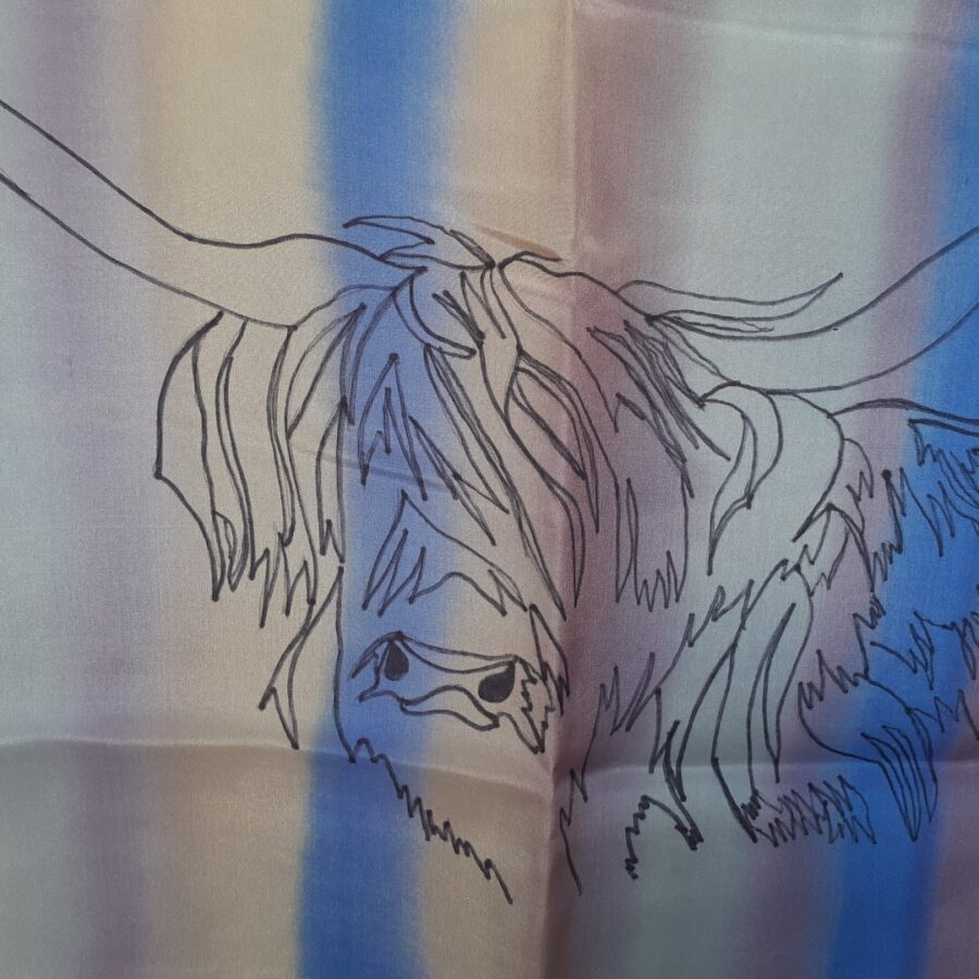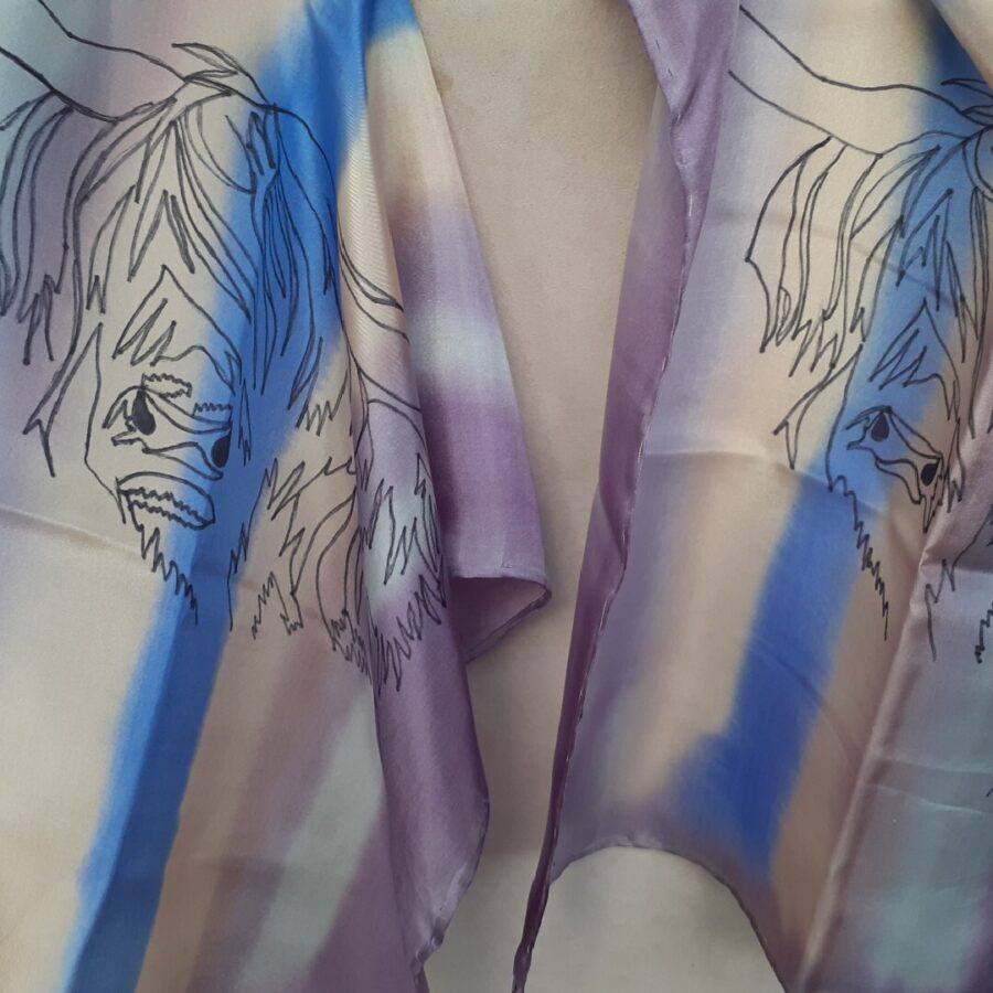 A beautiful hand painted heather and blue Highland Cow design long silk scarf.