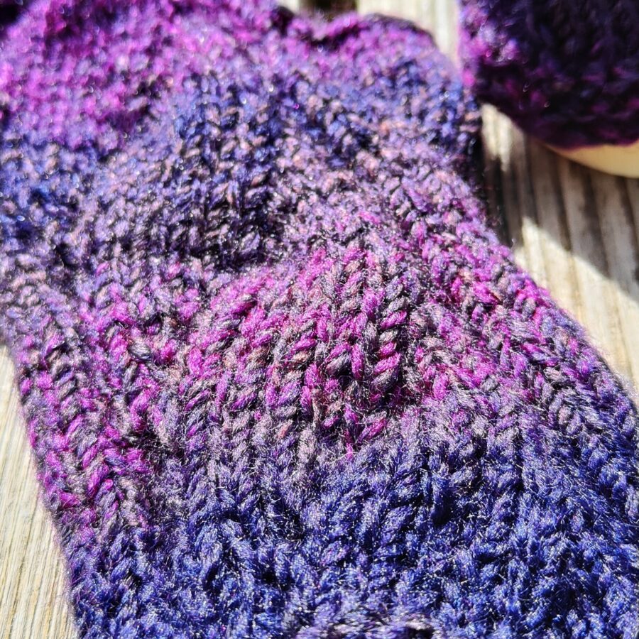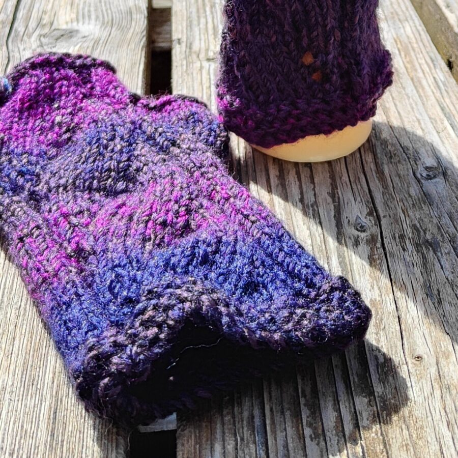 With colours inspired by the Scottish heather, these beautiful fingerless gloves/wrist warmers feature a twisted cable detail. They are hand knitted in chunky yarn for comfort and warmth. Machine washable at 30 degrees.