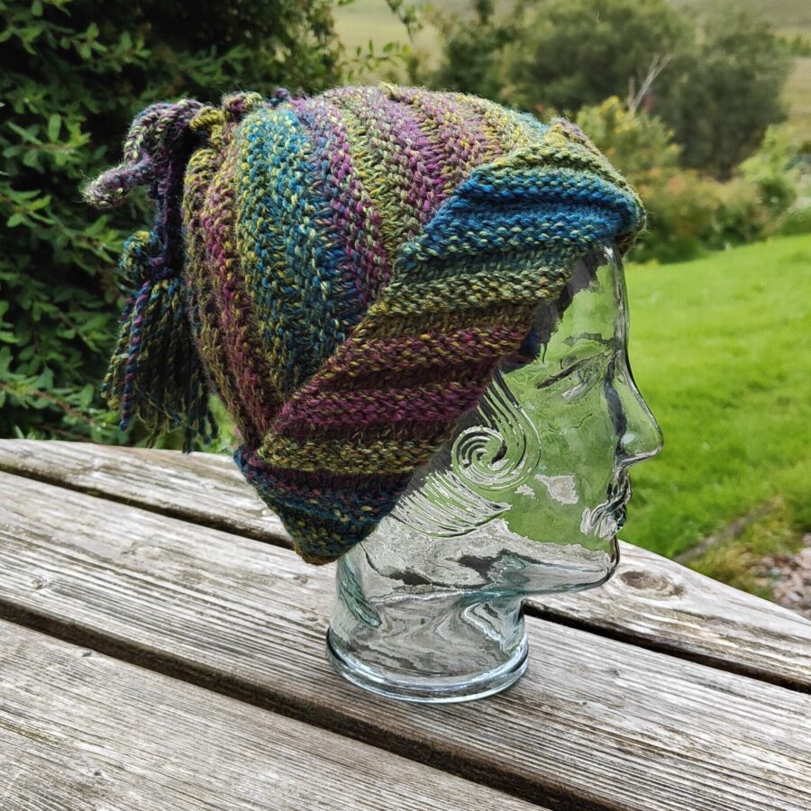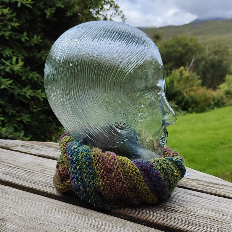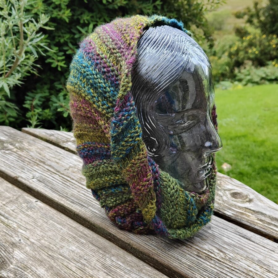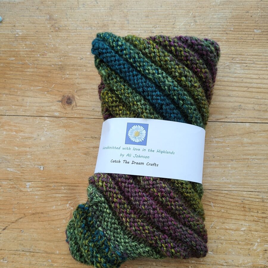 With colours inspired by the Scottish heather and moss, this unique and extremely useful three in one accessory can be worn around the neck as a scarf, pulled up over head as a snood, or pull and tie the drawstrings and it's a hat. Hand knitted using chunky yarn for softness and warmth. Machine washable at 30 degrees. Available in adult size which, because of the design, is suitable for most adults. However, if desired, can be knitted to order slightly smaller. (Made to order items may take up to three weeks depending on yarn availability).