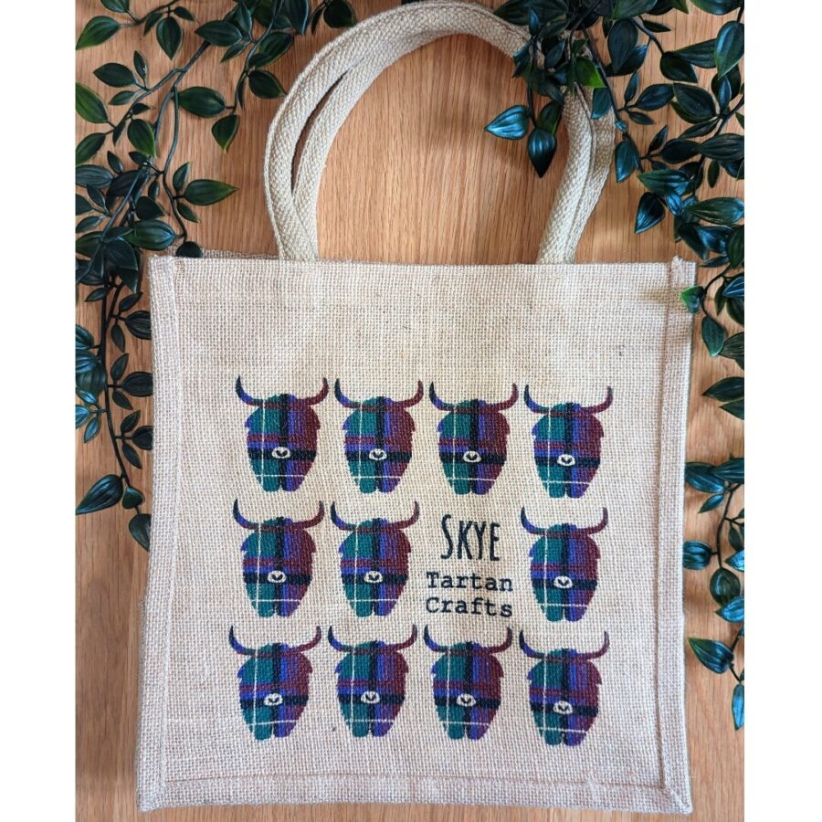 Meet Henrietta Coo! Designed by Ula, this gorgeous jute bag features lots of little Henrietta Coos in a pattern based on the Isle of Skye tartan. The design is the same on both sides. The perfect travel bag, now you can carry Henrietta with you wherever you go!