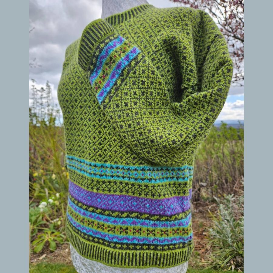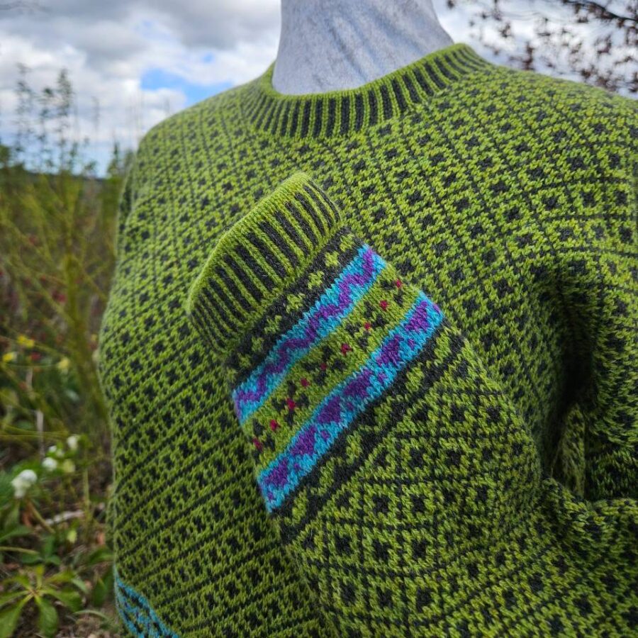 This little jumper is a casual, boxy shape, perfect for wearing on its own or layering under a jacket. It’s not too long (55cm approx.) and sits neatly on the hips. It is knitted in a mixture of lambswool and Shetland wool and offers a softness and warmth in a variety of beautiful colours. Based on similar patterns to the Craiglich design, Leadlich has a two colour lattice design on the body and sleeves, with a border of traditional patterns. As each item is individually made on a vintage hand-frame knitting machine, colours and patterns may vary slightly but the overall effect is similar.