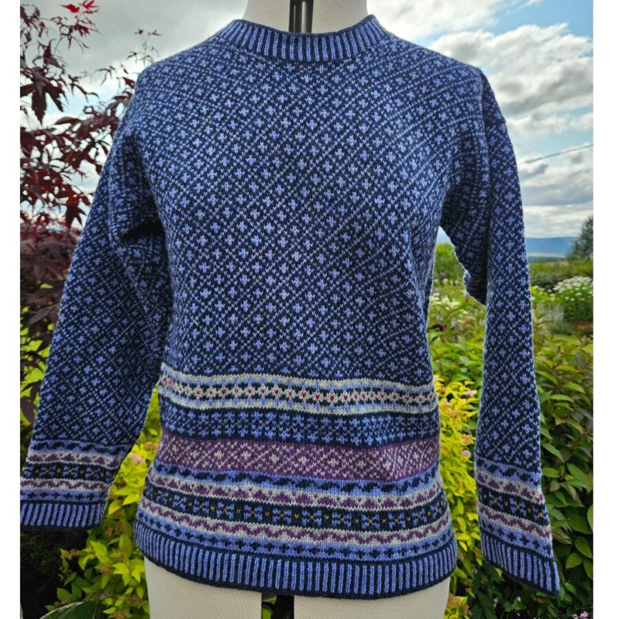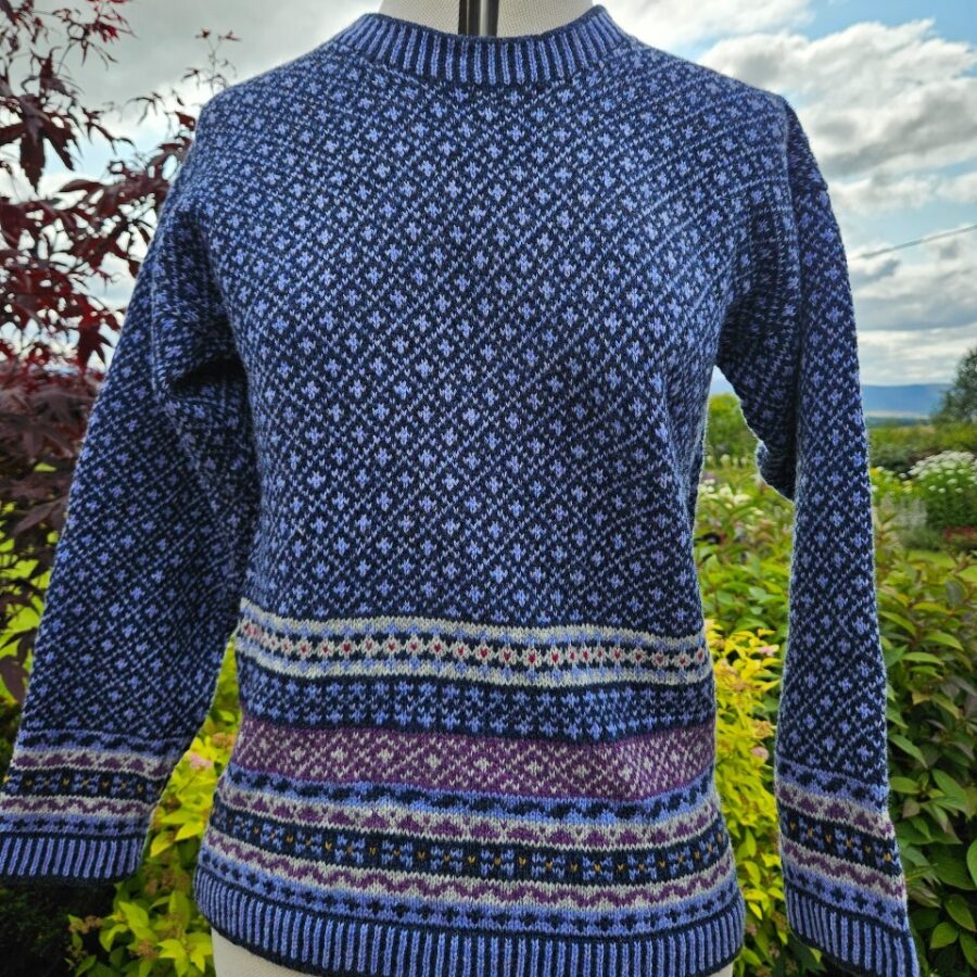 This little jumper is a casual, boxy shape, perfect for wearing on its own or layering under a jacket. It’s not too long (55cm approx.) and sits neatly on the hips. It is knitted in a mixture of lambswool and Shetland wool and offers a softness and warmth in a variety of beautiful colours. Based on similar patterns to the Craiglich design, Leadlich has a two colour lattice design on the body and sleeves, with a border of traditional patterns. As each item is individually made on a vintage hand-frame knitting machine, colours and patterns may vary slightly but the overall effect is similar.