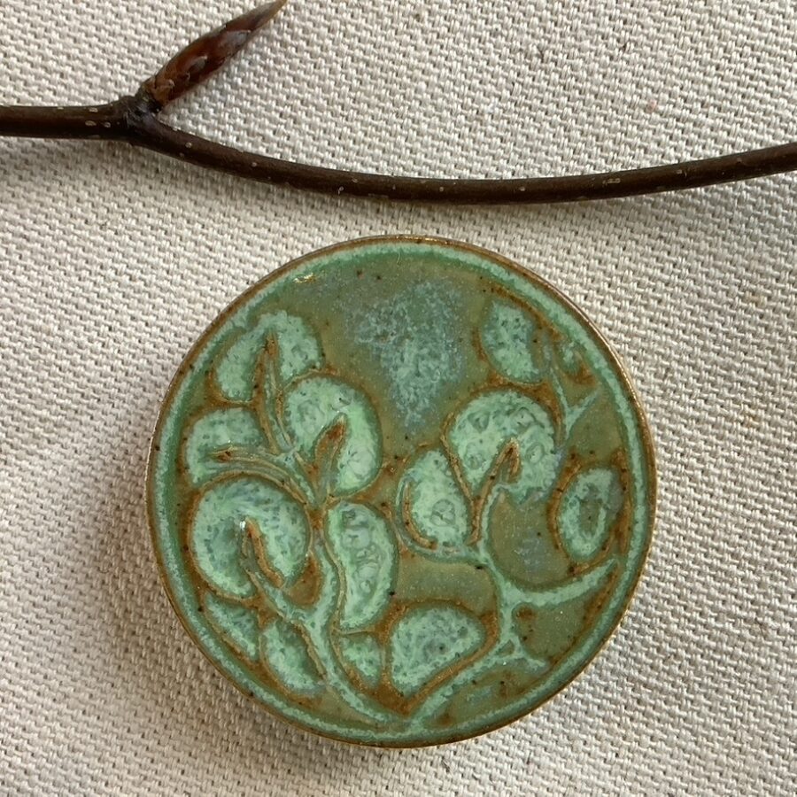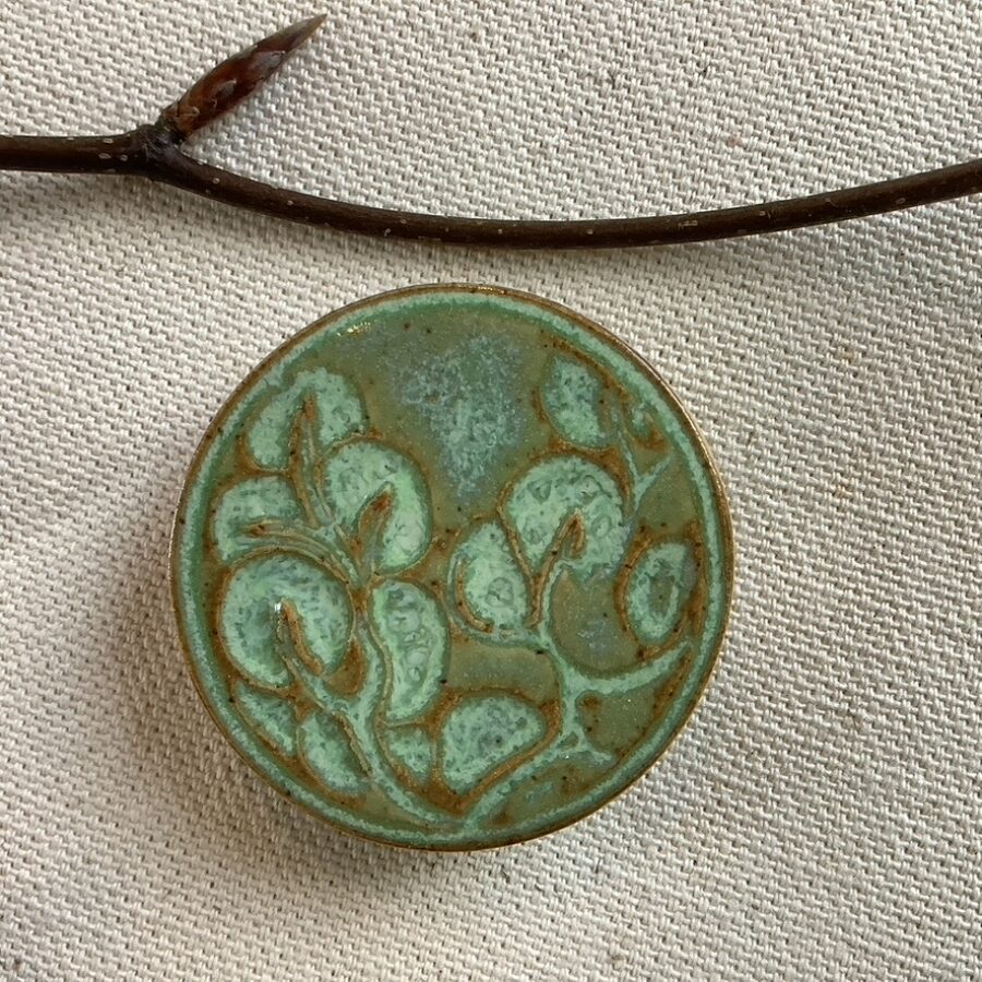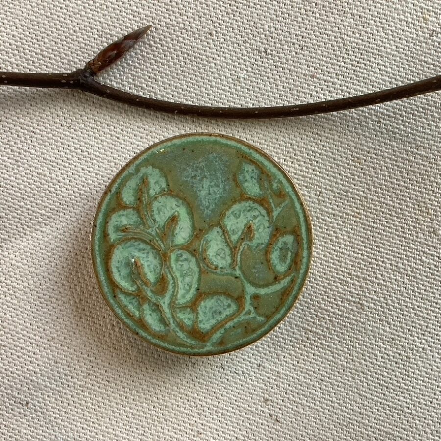 This ceramic brooch is made of stoneware clay with an embossed design of blossom under a light leaf-green glaze. The image shows a section taken from a lino cut out of the makers ‘Broadford Bay’ willow pattern design. This makers designs are all individually handcrafted with no two pieces being the same.