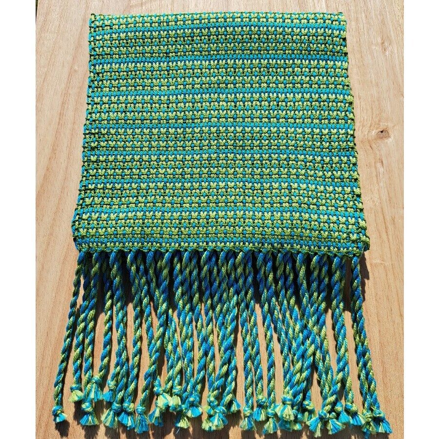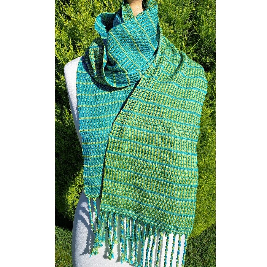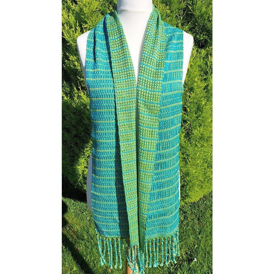 A long and slinky scarf to enhance any outfit. This lightweight scarf can be worn draped in multiple ways to embrace the neck. Woven from mercerised cotton and acrylic yarns in lime, turquoise and green on a rigid heddle loom, this unique accessory has a beautiful drape, while the jewel like quality of the mercerised cotton yarn packs a punch of colour.