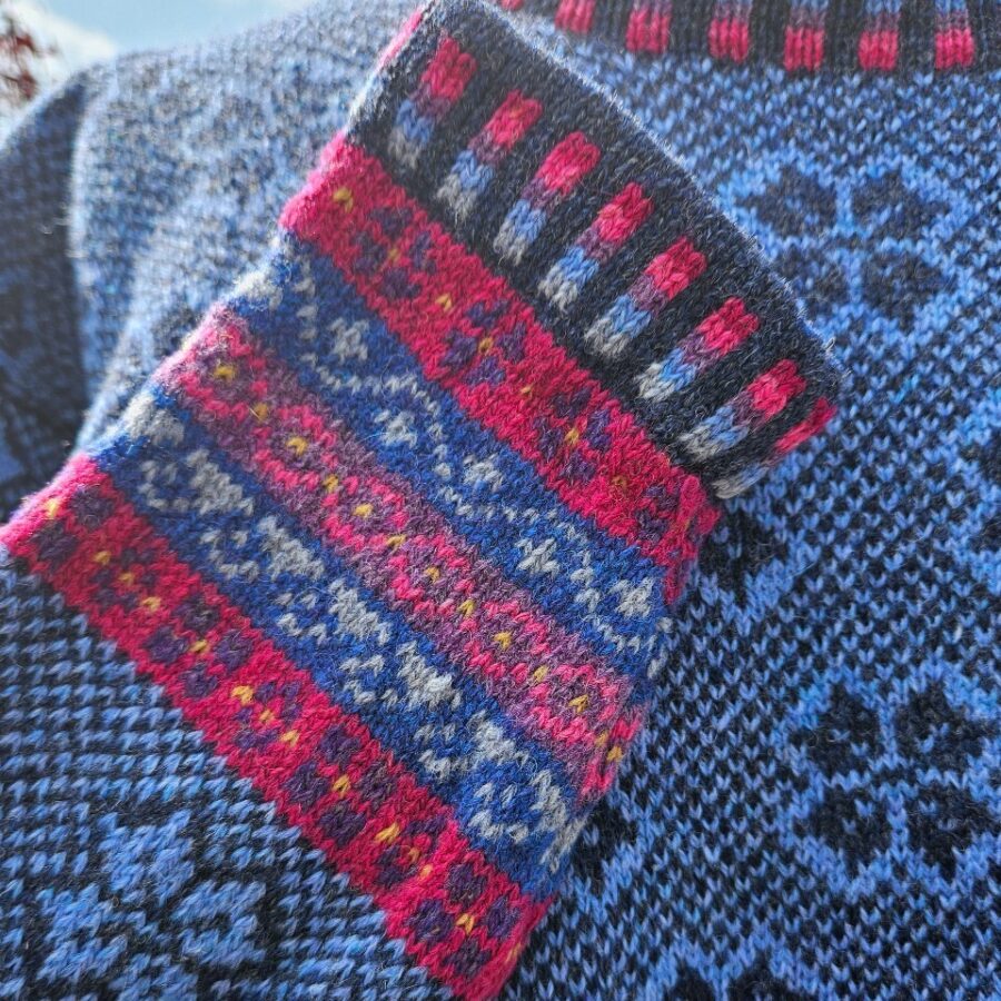This little jumper is a casual, boxy shape, perfect for wearing on its own or layering under a jacket. It’s not too long (55cm approx.) and sits nearly on the hips. It is knitted in a mixture of lambswool and Shetland wool and offers a softness and warmth in a variety of beautiful colours. The main colours are reversed for the sleeves, giving a subtle contrast and the border and cuffs are knitted in a variety of traditional peerie (small) patterns. As each item is individually made on a vintage hand-frame knitting machine, colours and patterns may vary slightly but the overall effect is similar. Colourway: Colourway: Denim/Bahama - the main colour is a dark blue with a vibrant pale blue contrast and the 'peerie' designs on the borders are in shades of blue, pink and purple.