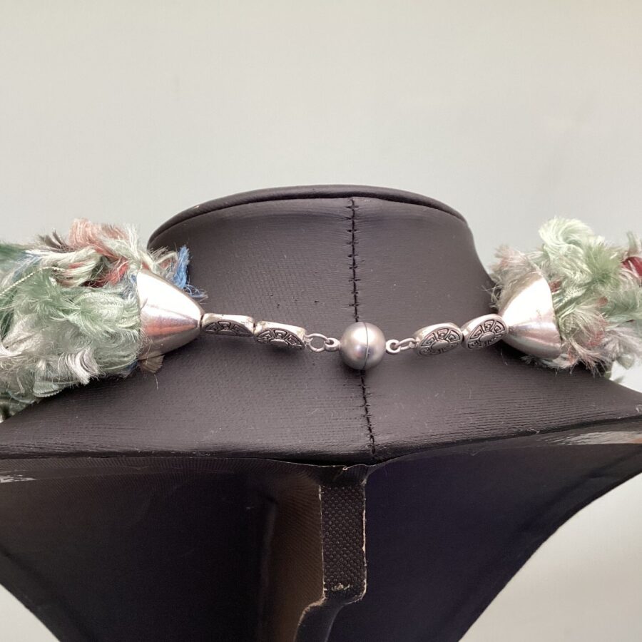 Twisted Scarves are designed to sit softly just below the neckline. Twist by holding the bead caps at the ribbon ends to create the desired length and shape. Open the magnet by holding adjacent beads and gently pull. The magnetic clasps are nickel free. Ideal to wear to compliment any outfit or to match your shoes or handbag etc to complete your desired look. Easy to wear and so suitable for anyone who struggles to fasten necklaces etc due to arthritis or other medical conditions.