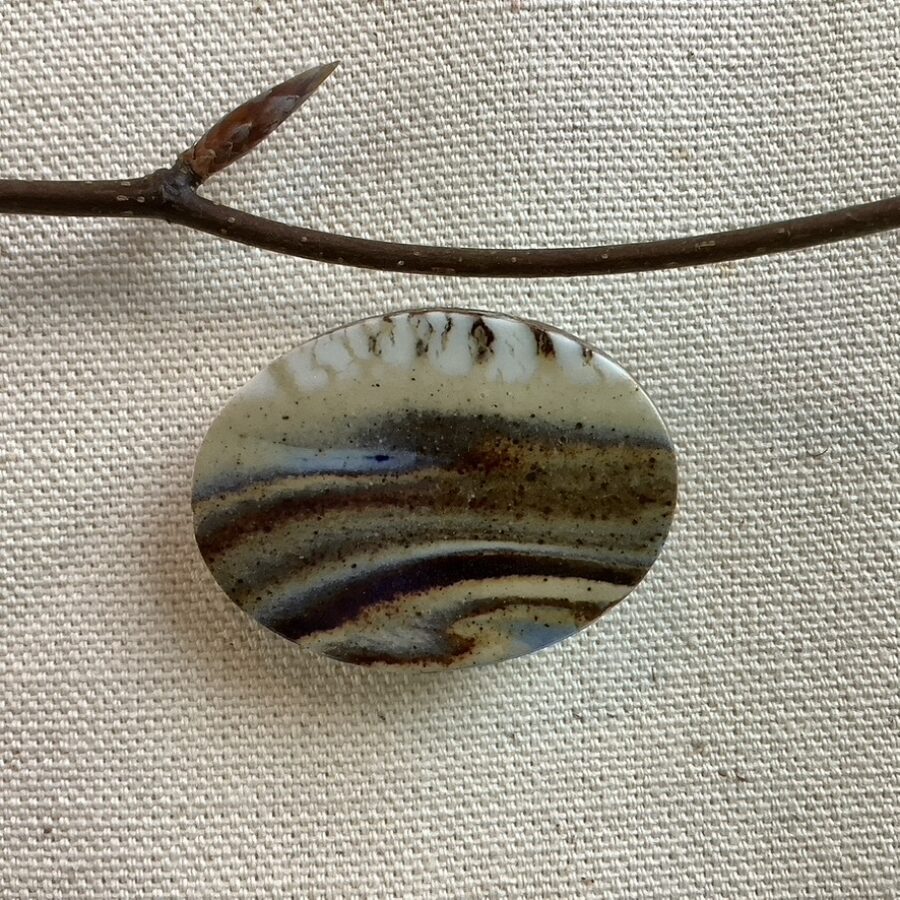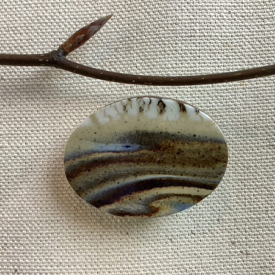 This ceramic brooch is made of mixed-clay bodies. Stoneware, porcelain, and terracotta are folded and rolled to create these stone-like brooches. Sections are then cut from the mixed clay sheet, with no two pieces ever coming out the same. The colours and patterns reflect the ever-changing Skye weather and landscapes.