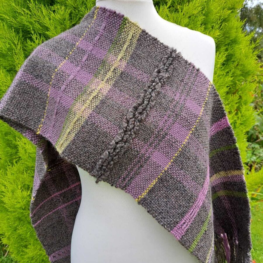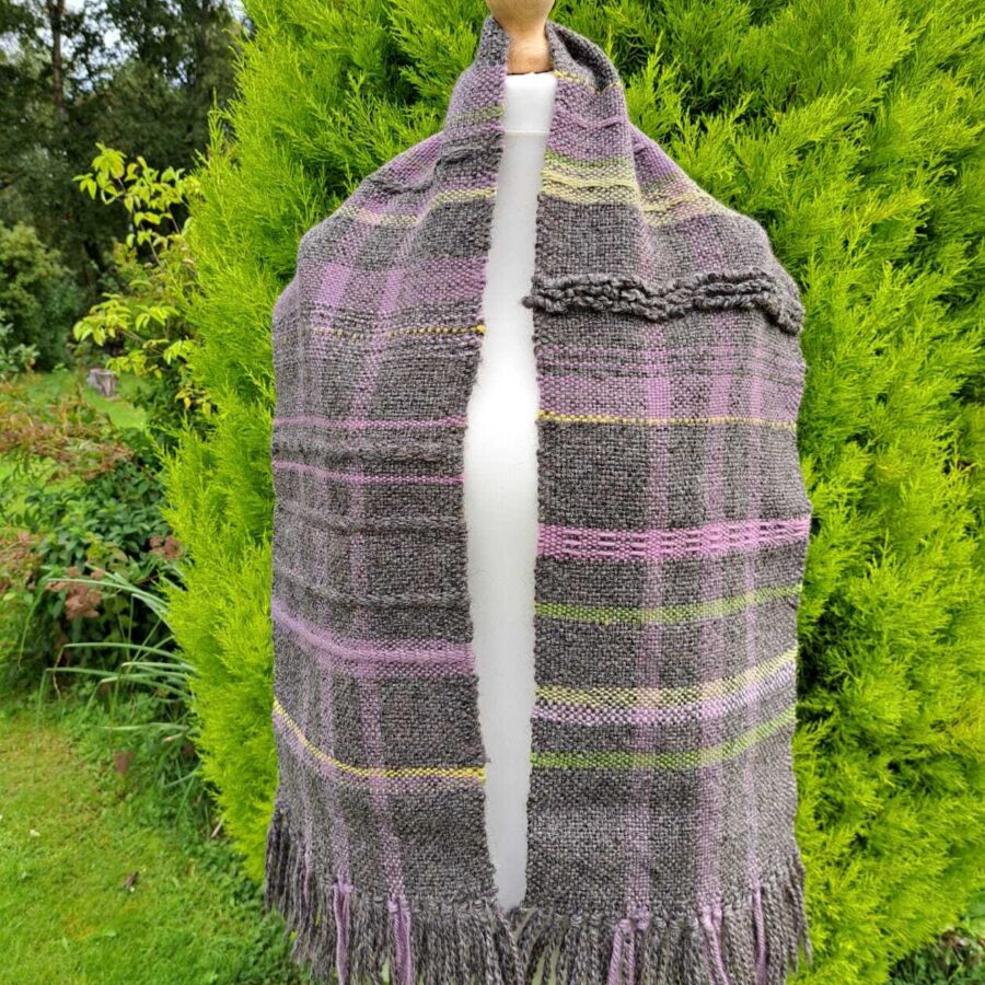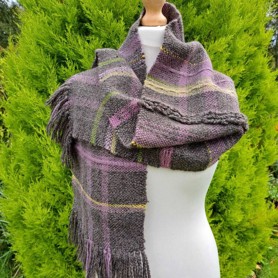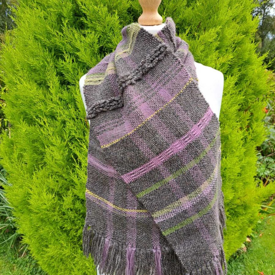 Measuring 11 x 56" or 28 x 142 cm this scarf was woven on a rigid heddle loom from wool and Alpaca yarns in stone, mauve, pink, green and gold colours. The basic smooth tabby weave is highlighted with random areas of pick-up and loop techniques that provide additional texture. The terminals are of knotted fringe.