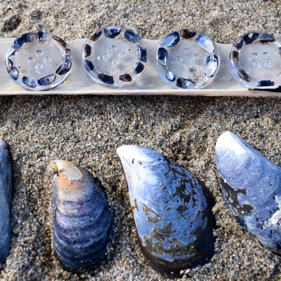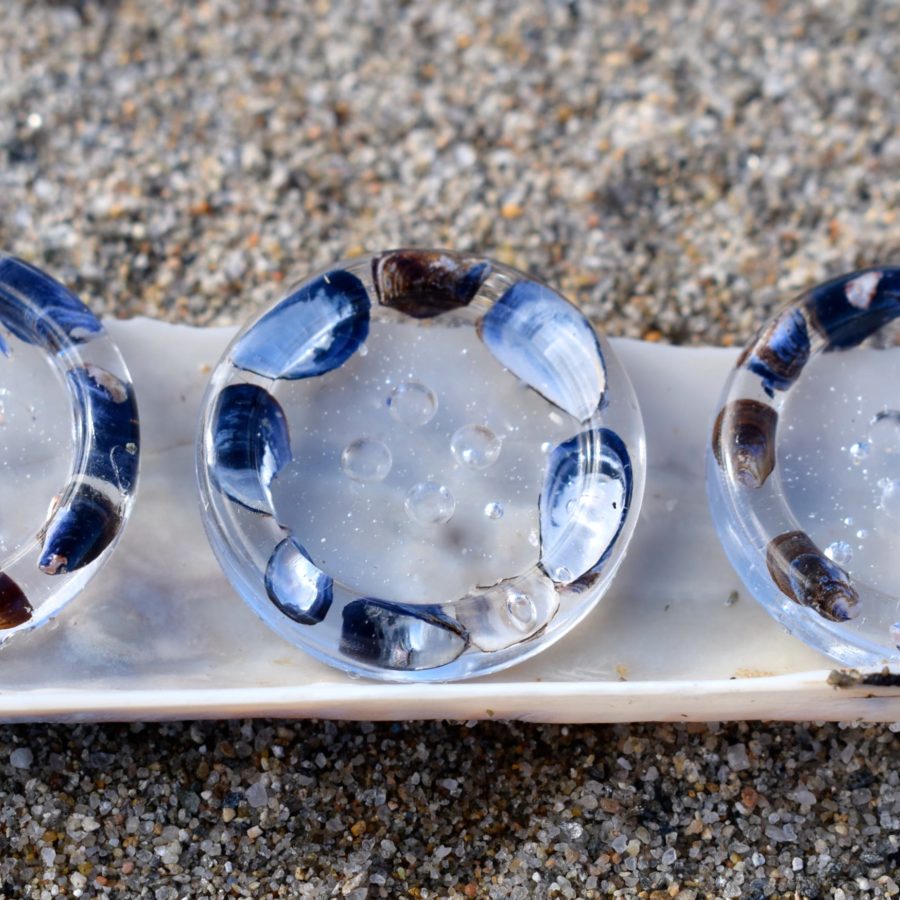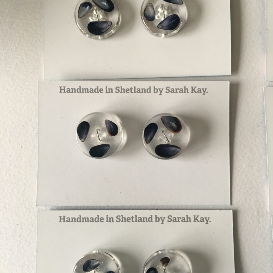 Tiny mussel shell buttons. Each one hand made by Sarah in her Shetland studio, from clear resin. There are 3 sizes available. They are sold as a matching pair, some with 3 shells, some with 4 depending on size of shells. They are attached to a card and come inside a matching organza gift bag. Choose your size in the drop down.