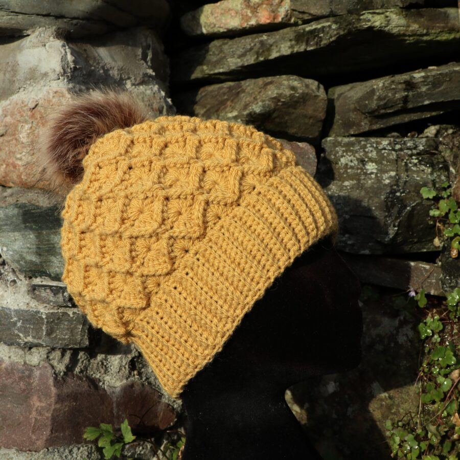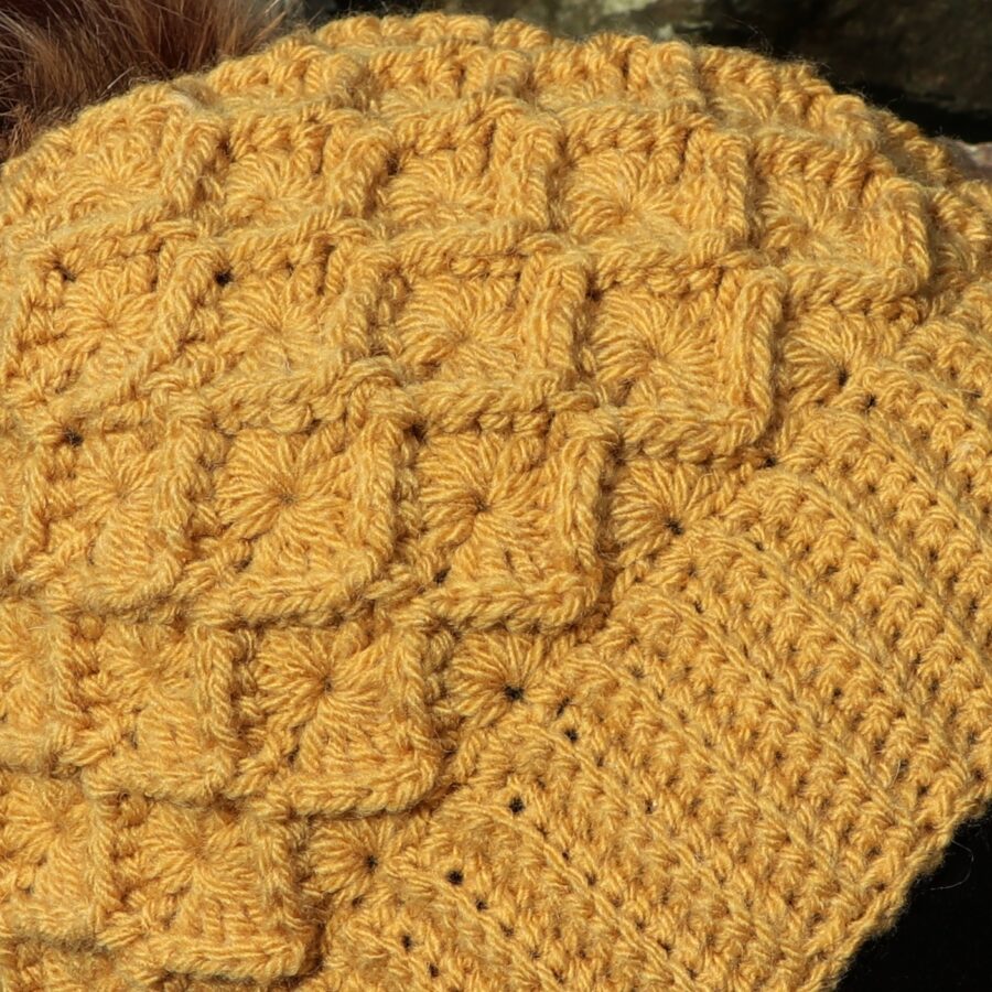 Brave the cold weather in style with this charming crocheted hat with faux fur pom pom. Ingrid used the Bavarian stitch to create a beautiful diamond-shape texture. The hat is made from 100% thick wool.