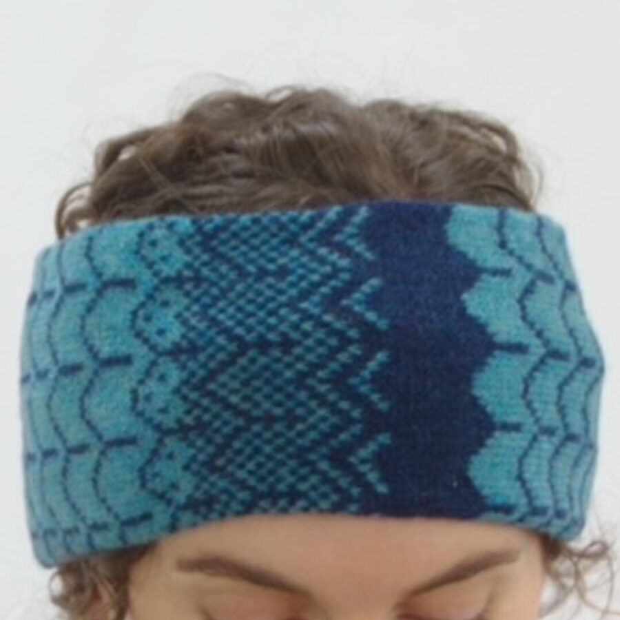 A beautiful new wave design headband machine knitted in 100% merino lambswool, colours are barracuda and regatta. An easy to wear, soft and cosy headband made in Orkney.