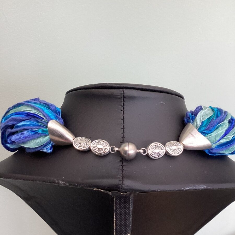 Twisted Scarves are designed to sit softly just below the neckline. Twist by holding the bead caps at the ribbon ends to create the desired length and shape. Open the magnet by holding adjacent beads and gently pull. The magnetic clasps are nickel free. Ideal to wear to compliment any outfit or to match your shoes or handbag etc to complete your desired look. Easy to wear and so suitable for anyone who struggles to fasten necklaces etc due to arthritis or other medical conditions.