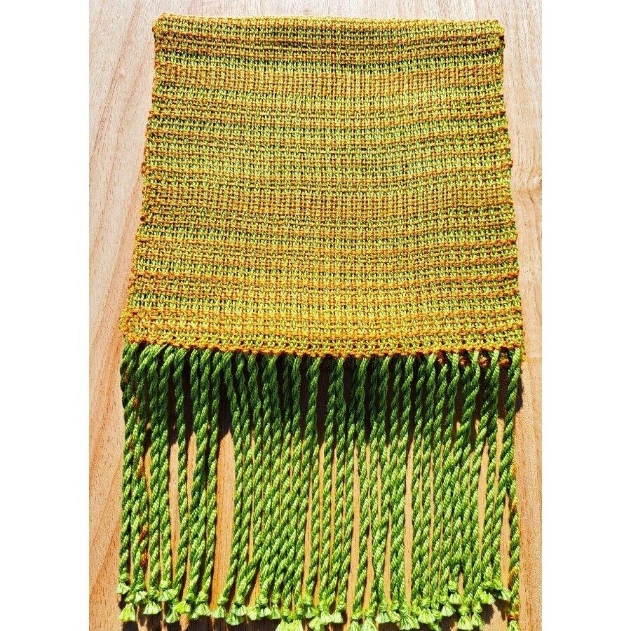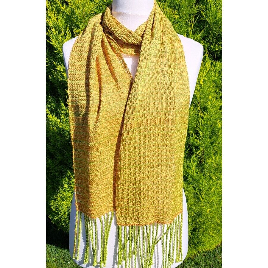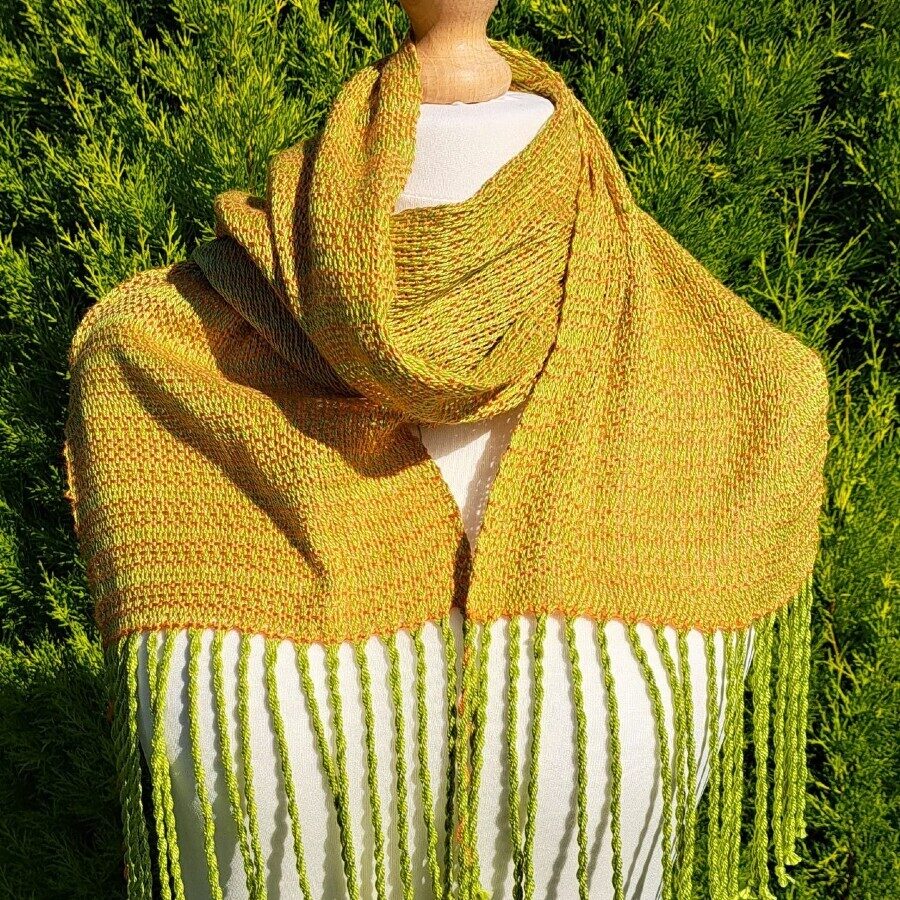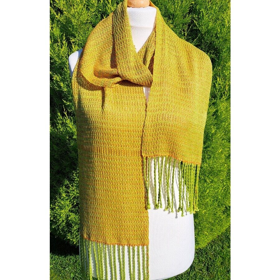 A long and slinky scarf to enhance any outfit. This ultra lightweight scarf can be worn draped in multiple ways to embrace the neck. Woven from mercerised cotton and acrylic yarns in lime and orange on a rigid heddle loom, this unique accessory has a beautiful drape, while the jewel like quality of the mercerised cotton yarn packs a punch of colour.