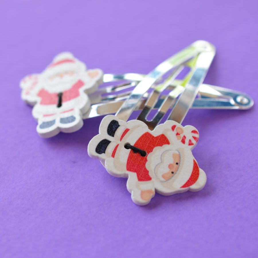 Funky huge button hair clips with a Santa Claus shaped button. Perfect for girls with lots of hair or even for grown-ups! 3 cm wooden buttons mounted on a 6 cm long silver-plated hair clip. Supplied in gift pouch.