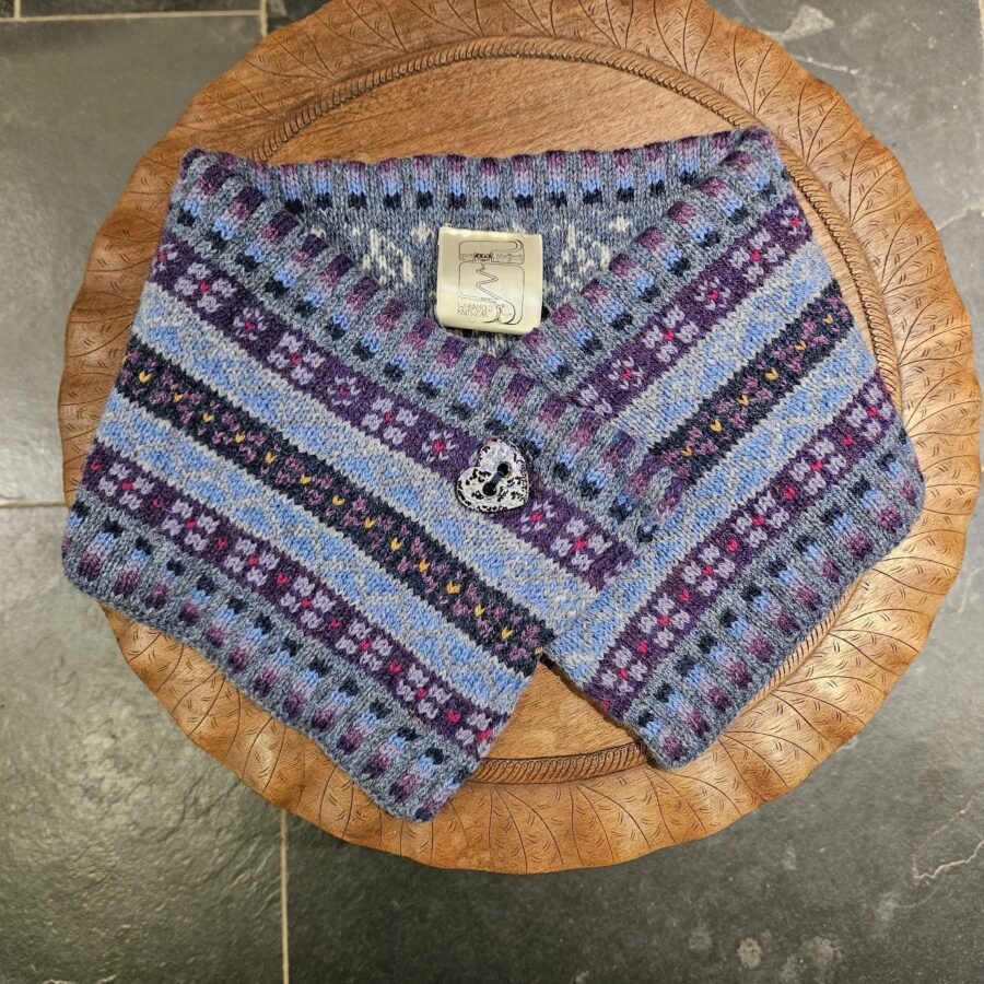 Colour way is Clipper/Silver: Mid-blue main colour with Paisley design in Silver and blue and purple Peerie patterns. Wool is very breathable, which means less frequent washing. However, when it does need to be washed, it should be hand washed in tepid water, given a quick spin or rolled in a towel to remove excess water, and dried flat. It can be pressed with a damp cloth and gently reshaped, if necessary. Given this wee bit of care, you will be able to enjoy wearing your Whinnyfold Knitwear clothing for years to come.