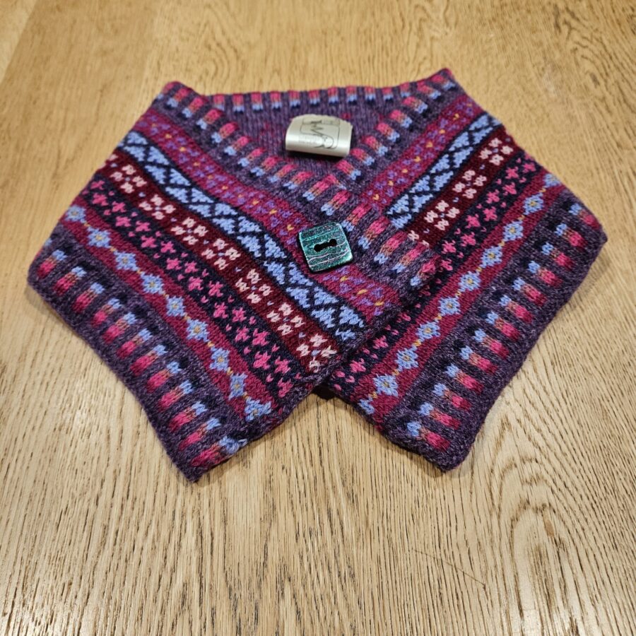 This colourful, hand-framed neckwarmer, in beautiful, soft lambswool, is ideal for keeping out the draughts when you don't want the bulk of a large scarf. The multicoloured 'Peerie' design is influenced by the wee patterns that are between the main motifs in Fair Isle knitting and the reverse pattern is based on the traditional 'Paisley' shape. Neckwarmers are fastened with an unusual wood, ceramic or handmade button.