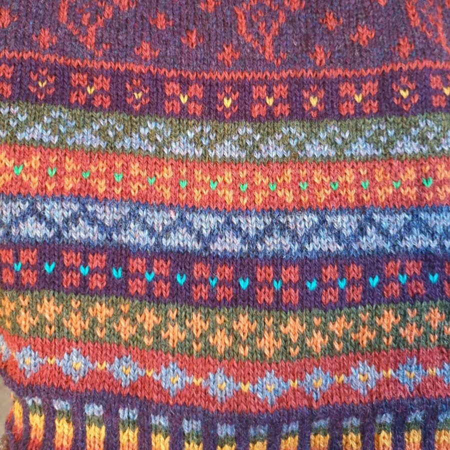 A colourful, loganberry, hand knitted scarf and gloves set. The 'Peerie' design is influenced by the wee patterns that are between the main motifs in Fair Isle knitting.