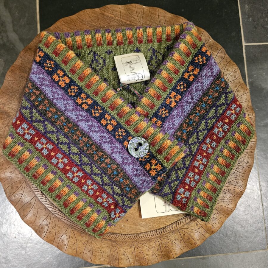 This colourful, hand-framed neckwarmer, in beautiful, soft lambswool, is ideal for keeping out the draughts when you don't want the bulk of a large scarf. The multicoloured 'Peerie' design is influenced by the wee patterns that are between the main motifs in Fair Isle knitting and the reverse pattern is based on the traditional 'Paisley' shape. Neckwarmers are fastened with an unusual wood, ceramic or handmade button.