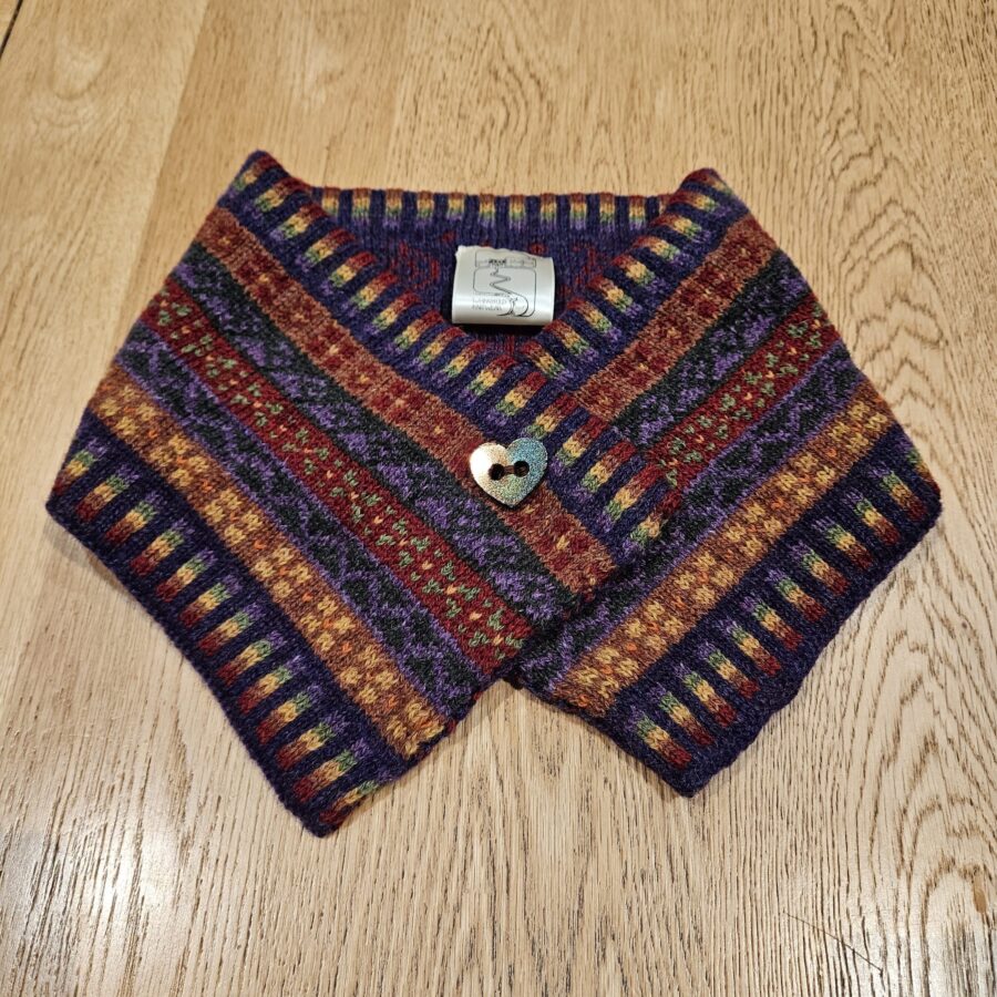 This colourful, hand-framed neckwarmer, in beautiful, soft lambswool, is ideal for keeping out the draughts when you don't want the bulk of a large scarf. The multicoloured 'Peerie' design is influenced by the wee patterns that are between the main motifs in Fair Isle knitting and the reverse pattern is based on the traditional 'Paisley' shape. Neckwarmers are fastened with an unusual wood, ceramic or handmade button.