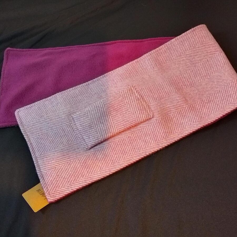 A stylish pink herringbone tweed scarf with plum fleece lining.