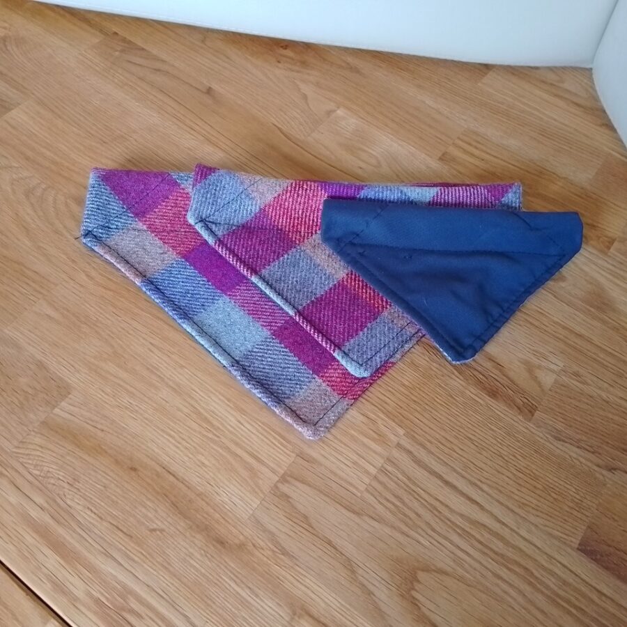 Gorgeous dog bandana made in a pink/purple Shetland Tweed with blue polyester lining. Available in different sizes.