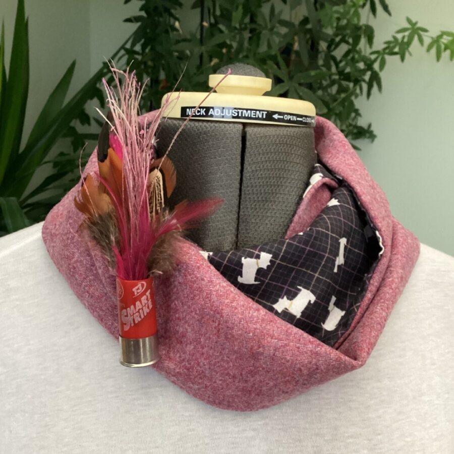 One side is made from Johnstons of Elgin pink tweed, the other a complementary Scotty dog cotton lining - all the glamour but none of the itch from real wool. Available with or without the brooch.