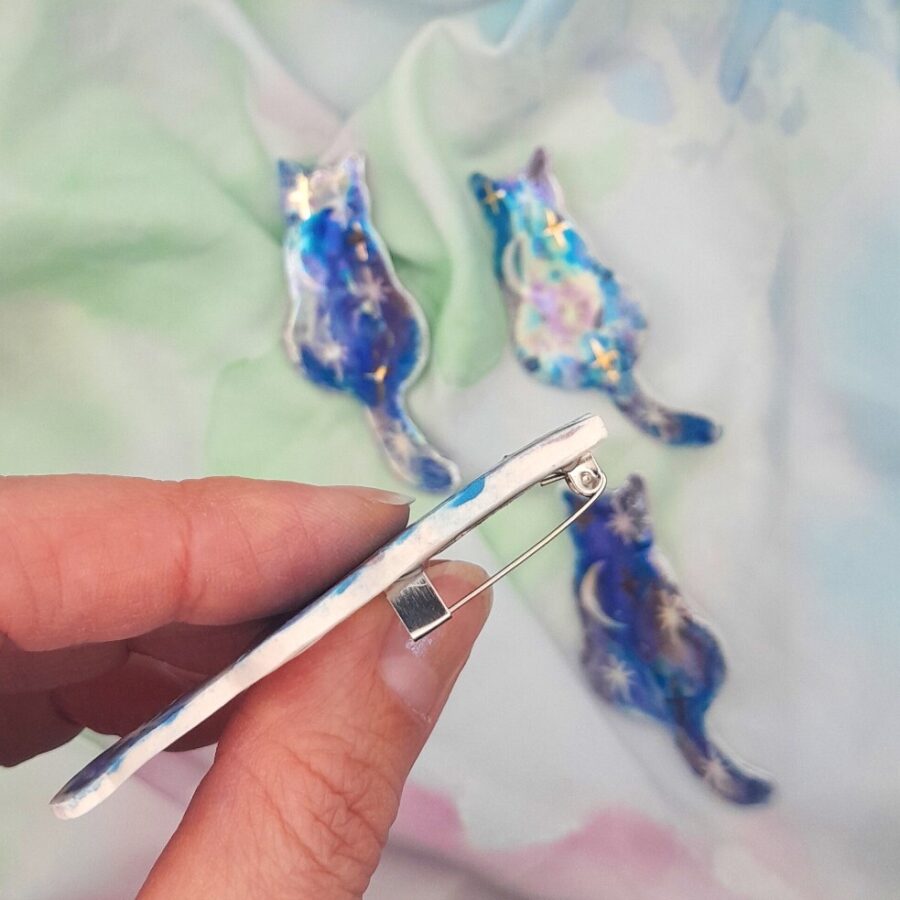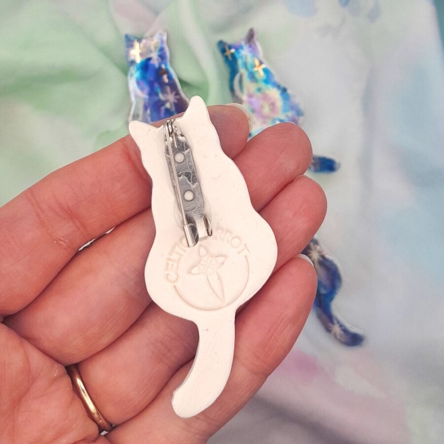 A hand painted cat shaped brooch with moon and star decoration. Finished with gold and mother of pearl lustre for an iridescent sheen.
