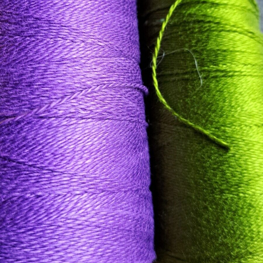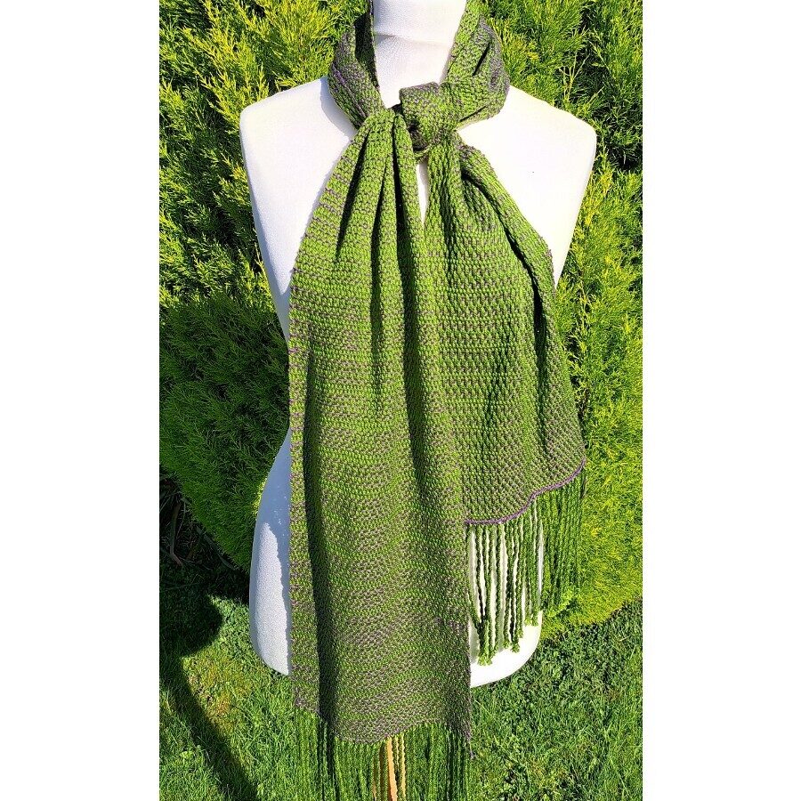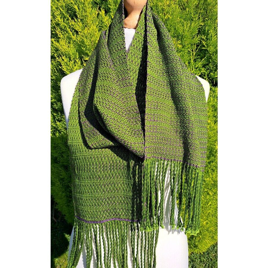 A long and slinky scarf to enhance any outfit. This lightweight scarf can be worn draped in multiple ways to embrace the neck. Woven from mercerised cotton and acrylic yarns in purple and green on a rigid heddle loom, this unique accessory has a beautiful drape, while the jewel like quality of the mercerised cotton yarn packs a punch of colour.