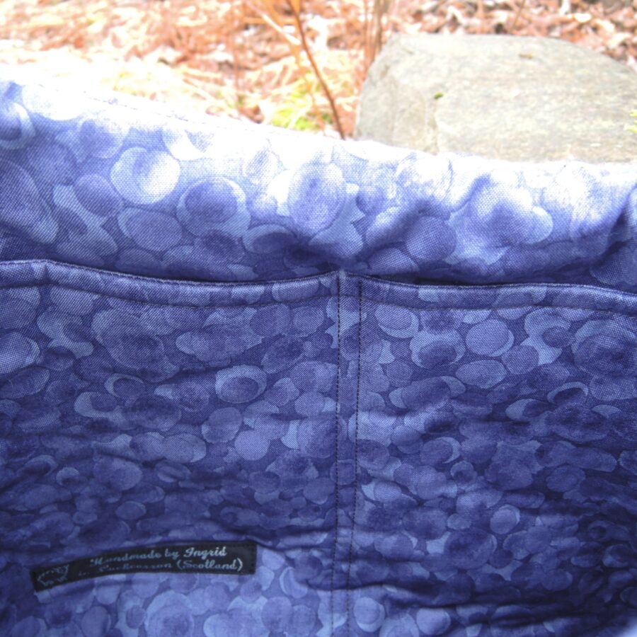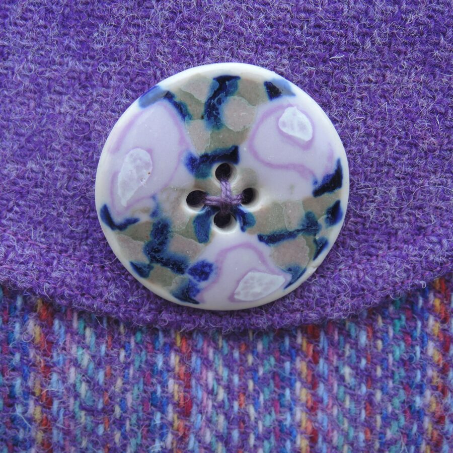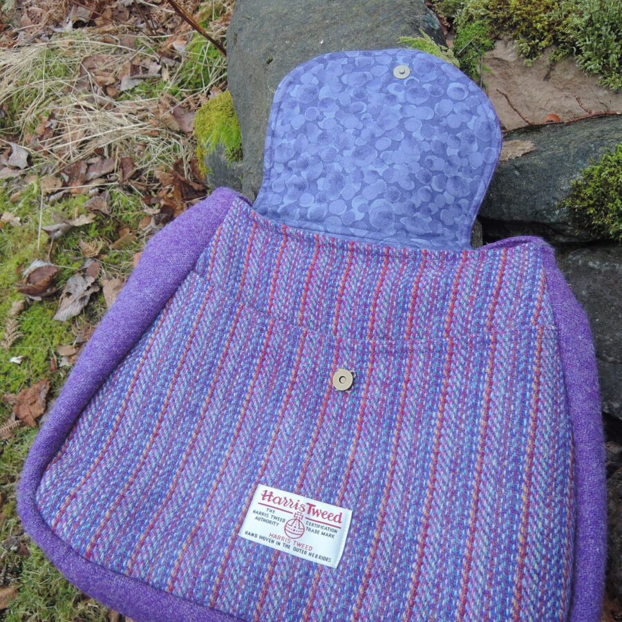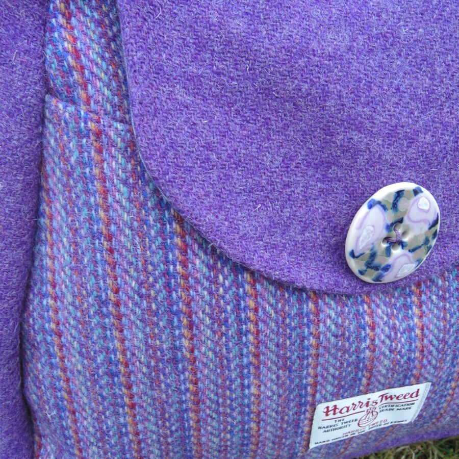 This is a lovely and unique purple Harris Tweed handbag made with a matching rainbow Harris Tweed (front and back). The bag has a big outside pocket, as well as 2 separate inside pockets. It closes with a magnetic button and is embellished with a handmade polymer clay button on the outside. The inside is lined with a matching blue/purple cotton fabric. The bag is 37 cm wide (at bottom) and is 26 cm deep. The strap measures from top of the bag to the middle of the strap 57 cm.
