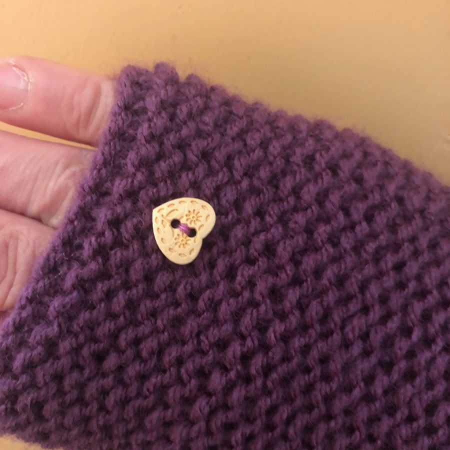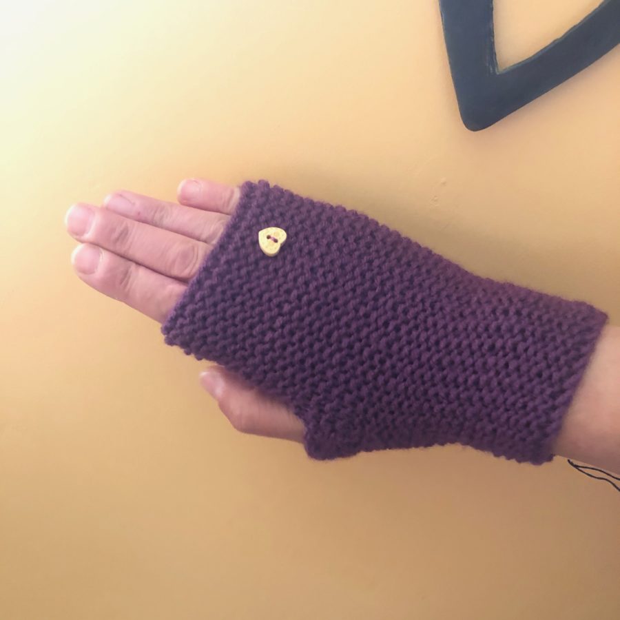 Purple hand knitted fingerless gloves adorned with wooden heart button.