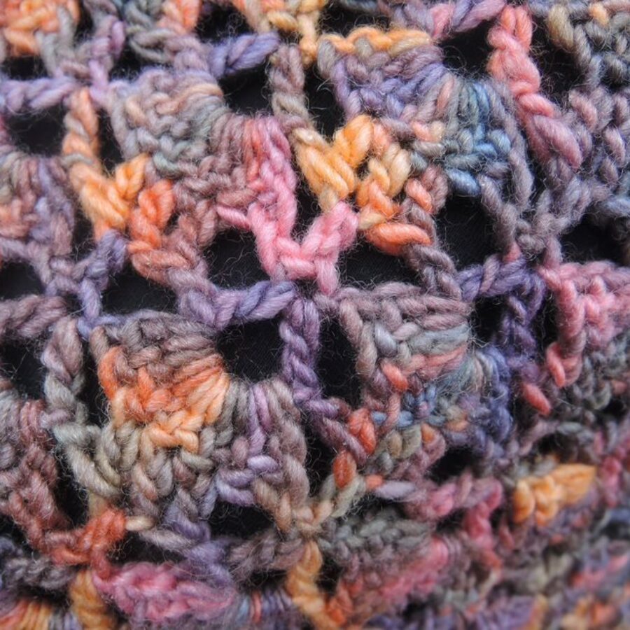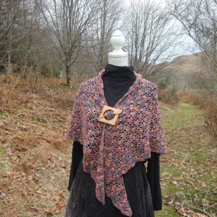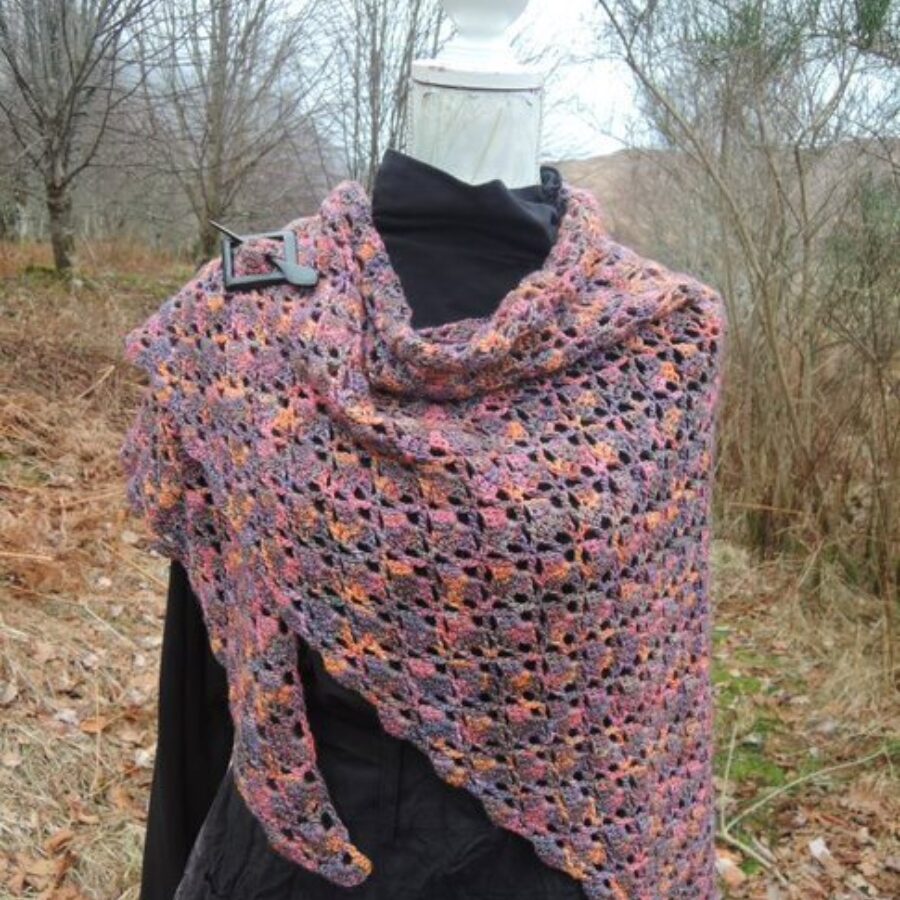 This is a lovely crochet triangular shaped shawl made from 30% silk and 70% merino extra fine wool in a subtle & warm purple/orange/pink colour. Manos silk blend is a luxurious blend of merino and silk which gives the shawl a subtle glow.