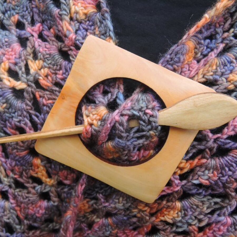 The yarn used is from Manos del Uruguay which is a non-profit organisation which assembles over 400 artisans in cooperatives scattered throughout the countryside of Uruguay. The aim of the organisation is to bring economic and social opportunities to rural woman. It is hand dyed in large kettles to create a marbleised, subtly striated effect that forms a rich palette of glorious colours. No two skeins are exactly alike and there are no dye lots. The shawl carries the signature of the craftswoman who made it, together with the name of the locality and the non-profit cooperative where it was made. The wooden shawl pin is not included in the price but can be purchased separately for an additional £5 (select using the dropdown). The shawl pin is available in a black diamond shape or a light brown rectangular shape.