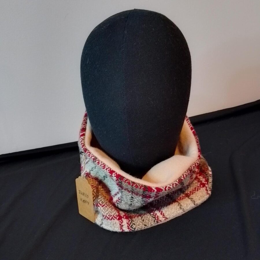 A stylish red and beige checked shetland tweed cowl with a cosy beige fleece lining.