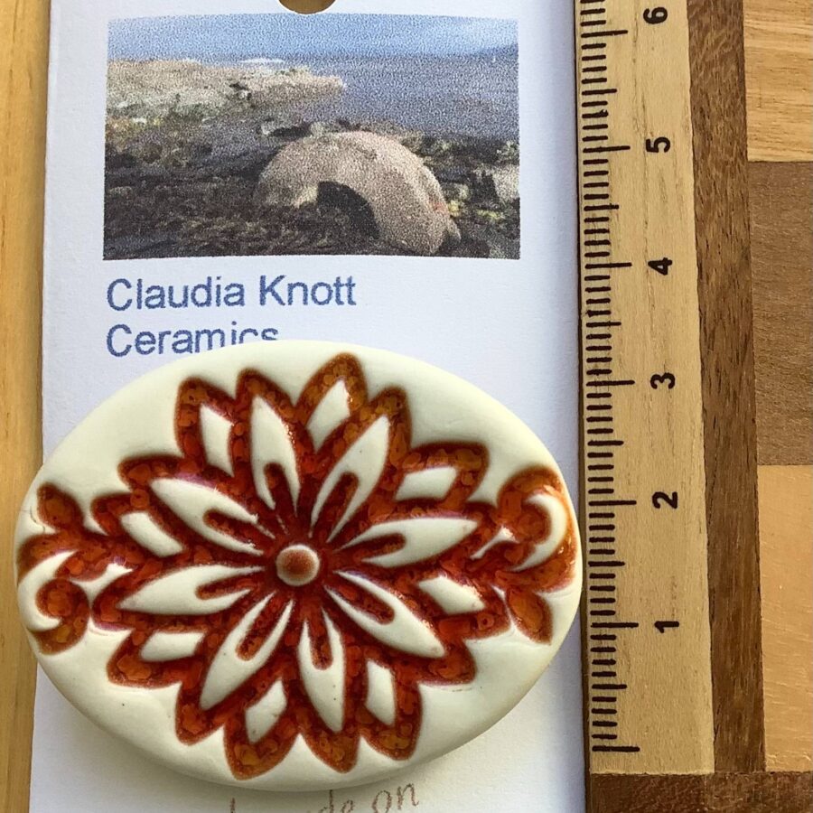 This ceramic brooch is made of white stoneware clay with an embossed ‘Chrysanthemum’ design filled with a Red Ember glaze. This makers pieces are all individually handcrafted with no two pieces being the same.