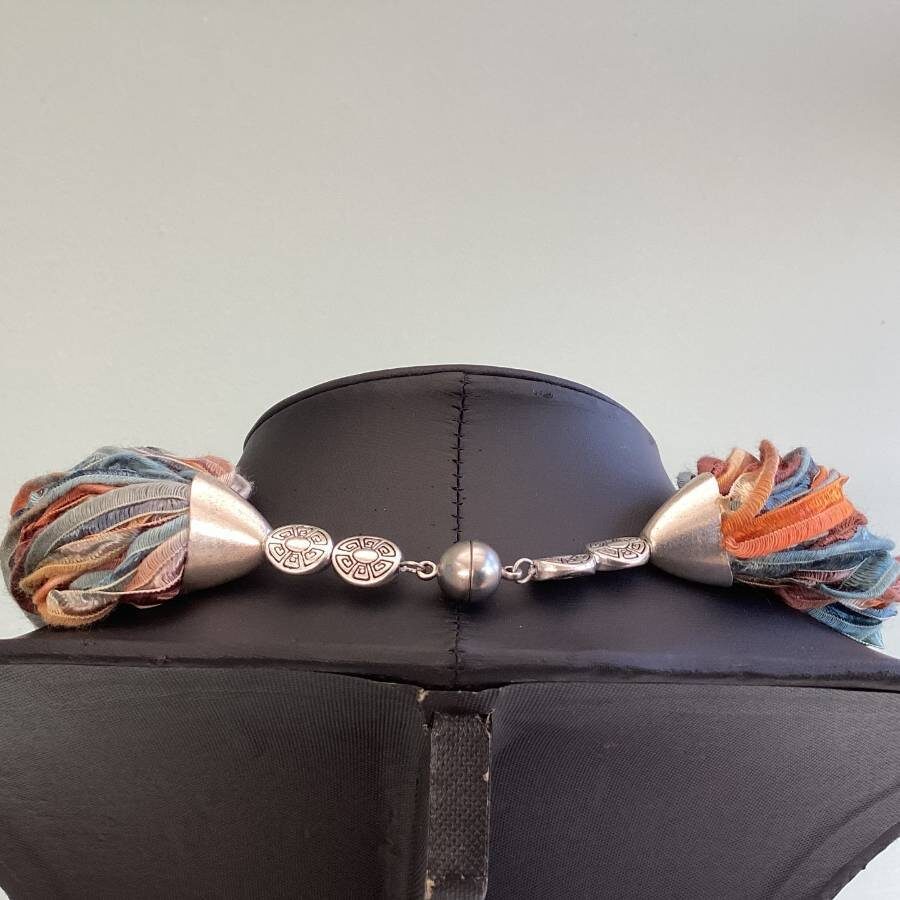 Twisted Scarves are designed to sit softly just below the neckline. Twist by holding the bead caps at the ribbon ends to create the desired length and shape. Open the magnet by holding adjacent beads and gently pull. The magnetic clasps are nickel free. Ideal to wear to compliment any outfit or to match your shoes or handbag etc to complete your desired look. Easy to wear and so suitable for anyone who struggles to fasten necklaces etc due to arthritis or other medical conditions.