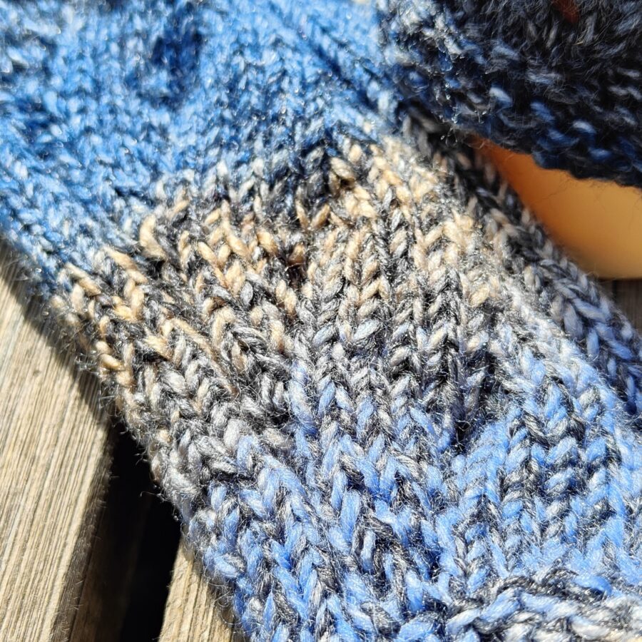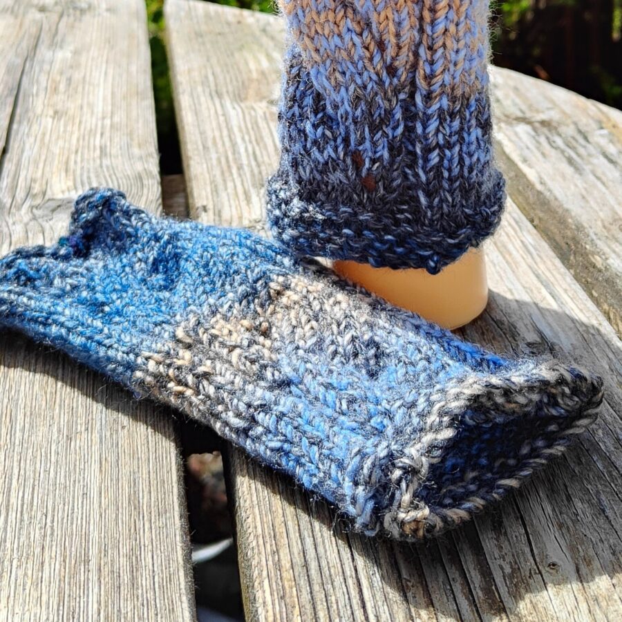 The blues and creams of these beautiful fingerless gloves/wrist warmers epitomises the colours of the sea and shoreline of the North West Highlands. Featuring a twisted cable detail, they are hand knitted in chunky yarn for comfort and warmth. Machine washable at 30 degrees.