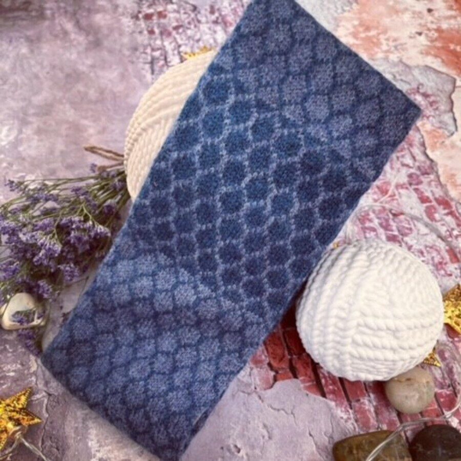 A beautiful sea faces design headband machine knitted in 100% merino lambswool, colours are monsoon and diesel. An easy to wear, soft headband made in Orkney. The design was taken from a fossilised stone the maker found on a beach near her home.