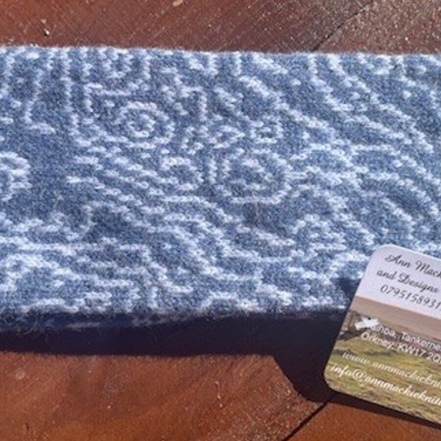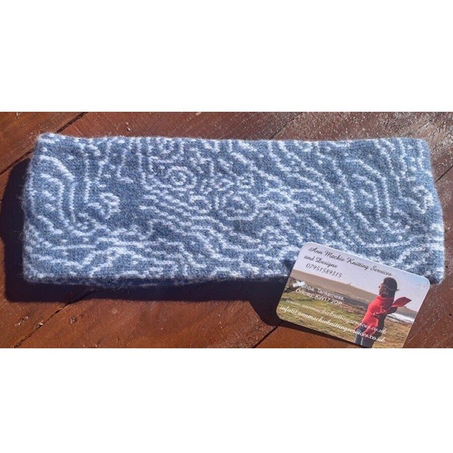A beautiful sea faces design headband machine knitted in 100% merino lambswool, colours are monsoon and pale lavender. An easy to wear, soft headband made in Orkney. The design was taken from a fossilised stone the maker found on a beach near her home.