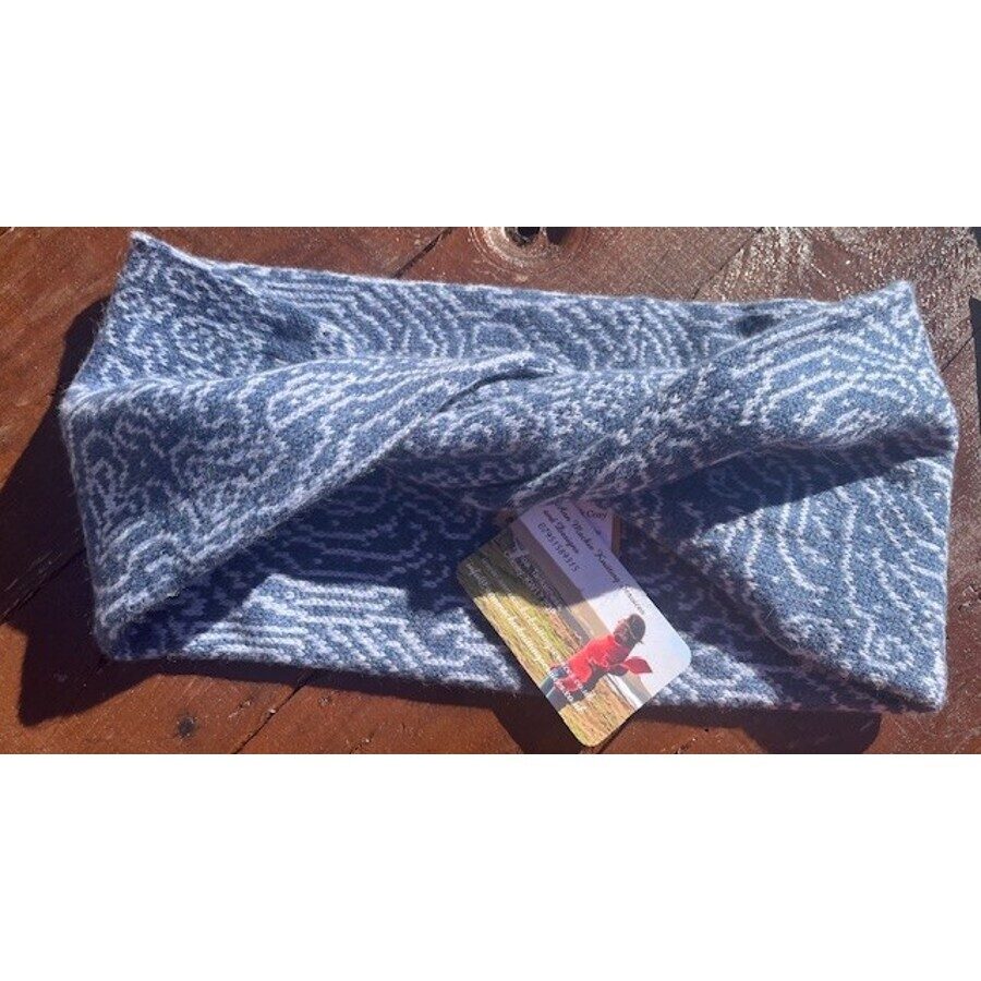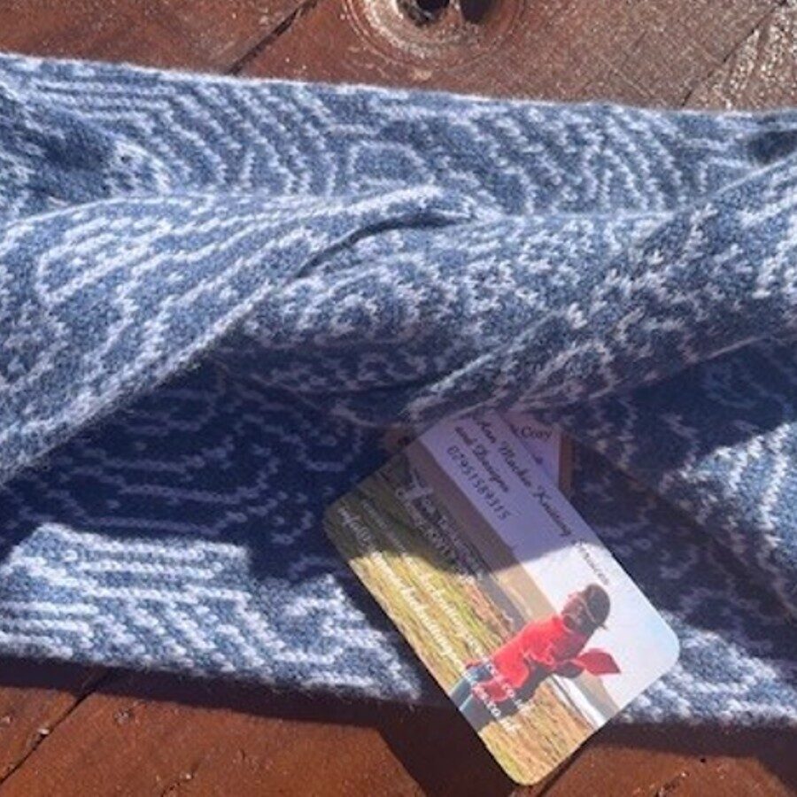 A beautiful sea faces design twisted neck cosy machine knitted in 100% merino lambswool, colours are monsoon and pale lavender. An easy to wear, soft neck cosy made in Orkney. The design was taken from a fossilised stone the maker found on a beach near her home.