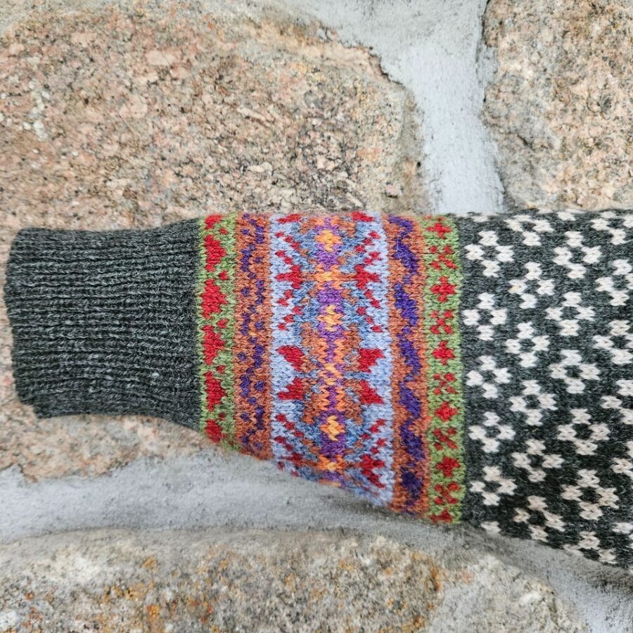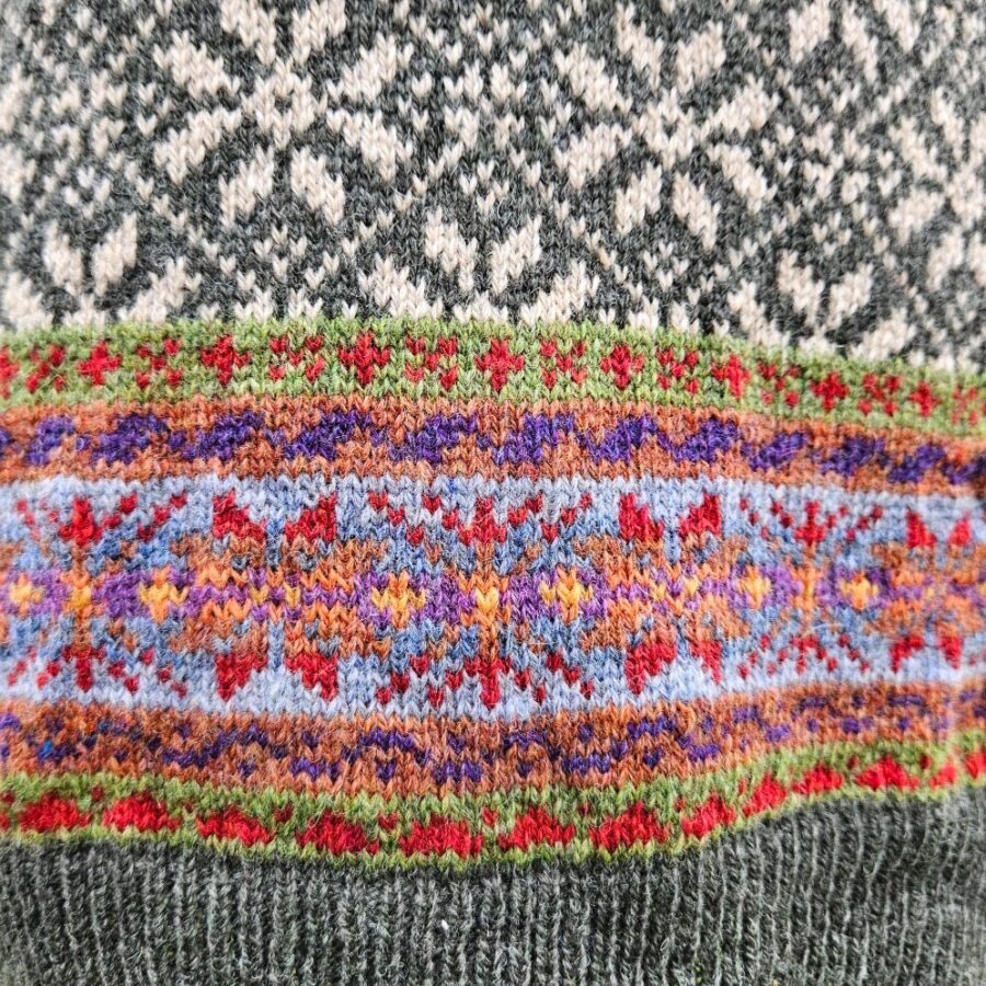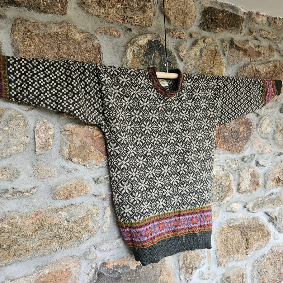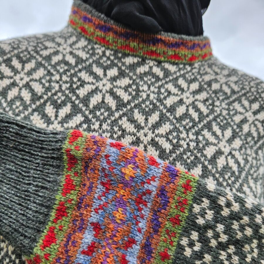 This design is based on traditional Fair Isle patterns and is named after the ancient stone circle near Tarland. The Tomnaverie jumper has a main pattern of a stylised star, with a contrasting border detail. The sleeves have the same border but feature a smaller main pattern. This jumper has ribbed cuffs and welt and is suitable for men and women. As each item is individually made on a vintage hand-frame knitting machine, colours and sizes may vary slightly but the overall effect is similar. Colourway: Spruce/Oatmilk. The main colour is a dark green with a beige contrast. The border is autumnal and blue shades with blue and purple peerie patterns. This unisex jumper has been knitted in a slightly longer length (73cm) than standard, making it very suitable for men who would like an original jumper that’s a wee bit different from mainstream woollies. However, it is also available to order to suit your requirements.