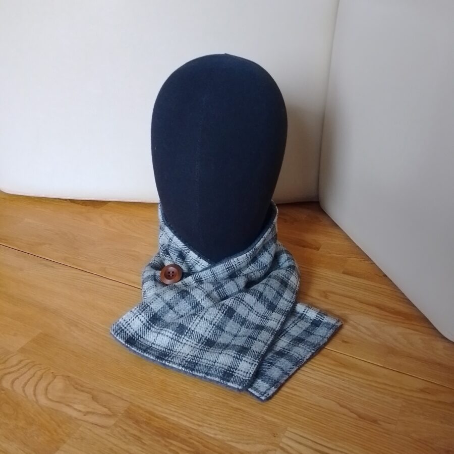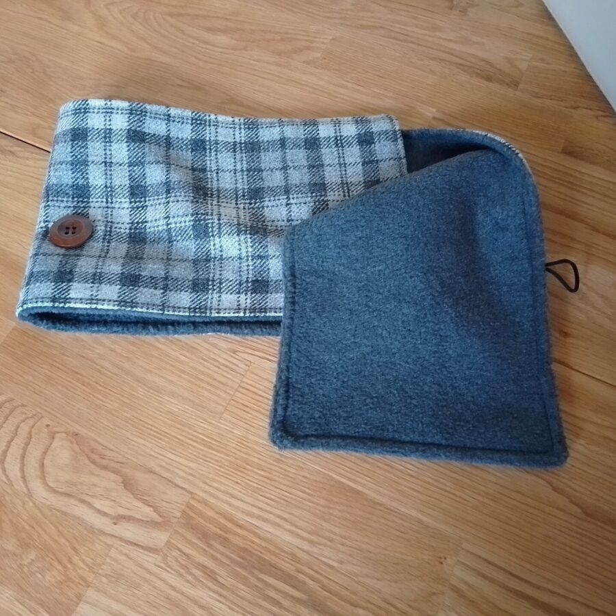 A stylish storm cloud tweed neck warmer with a dark grey fleece lining. It has a wooden and leather fastener.