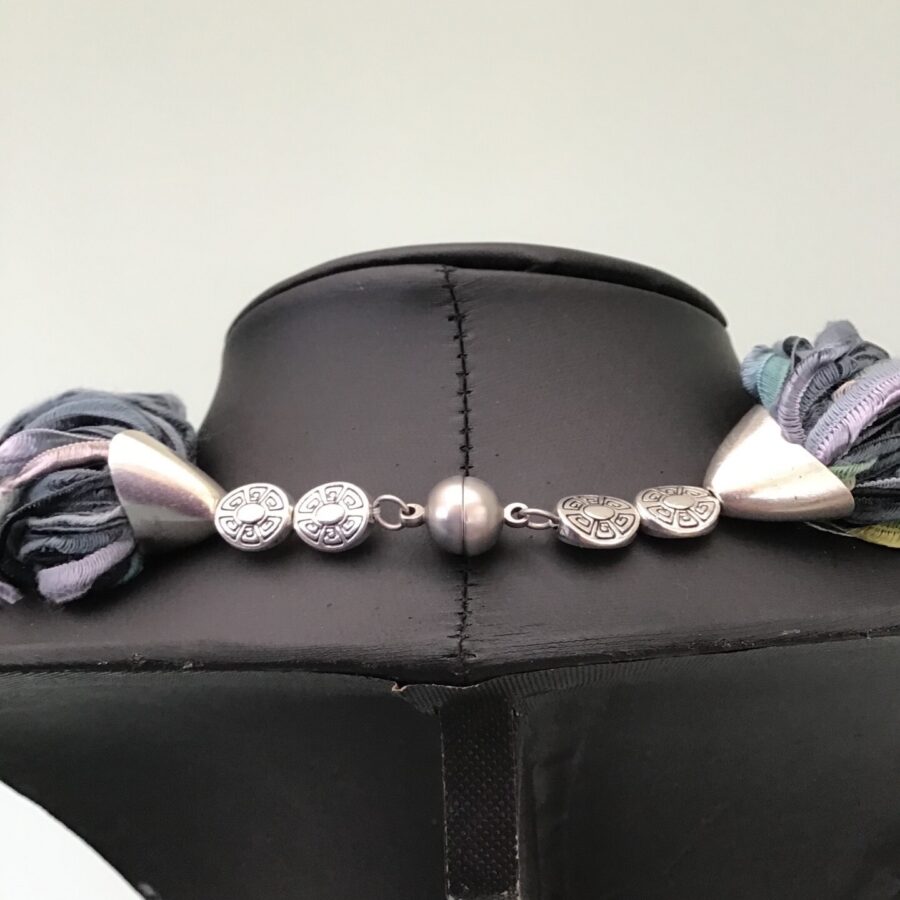Twisted Scarves are designed to sit softly just below the neckline. Twist by holding the bead caps at the ribbon ends to create the desired length and shape. Open the magnet by holding adjacent beads and gently pull. The magnetic clasps are nickel free. Ideal to wear to compliment any outfit or to match your shoes or handbag etc to complete your desired look. Easy to wear and so suitable for anyone who struggles to fasten necklaces etc due to arthritis or other medical conditions.
