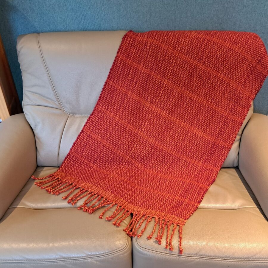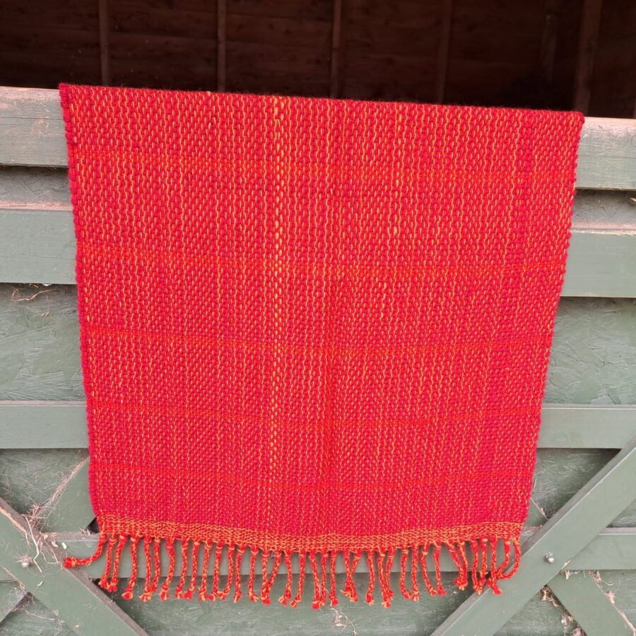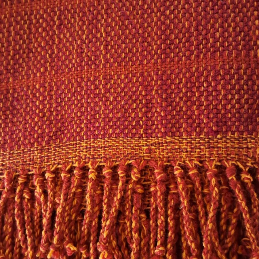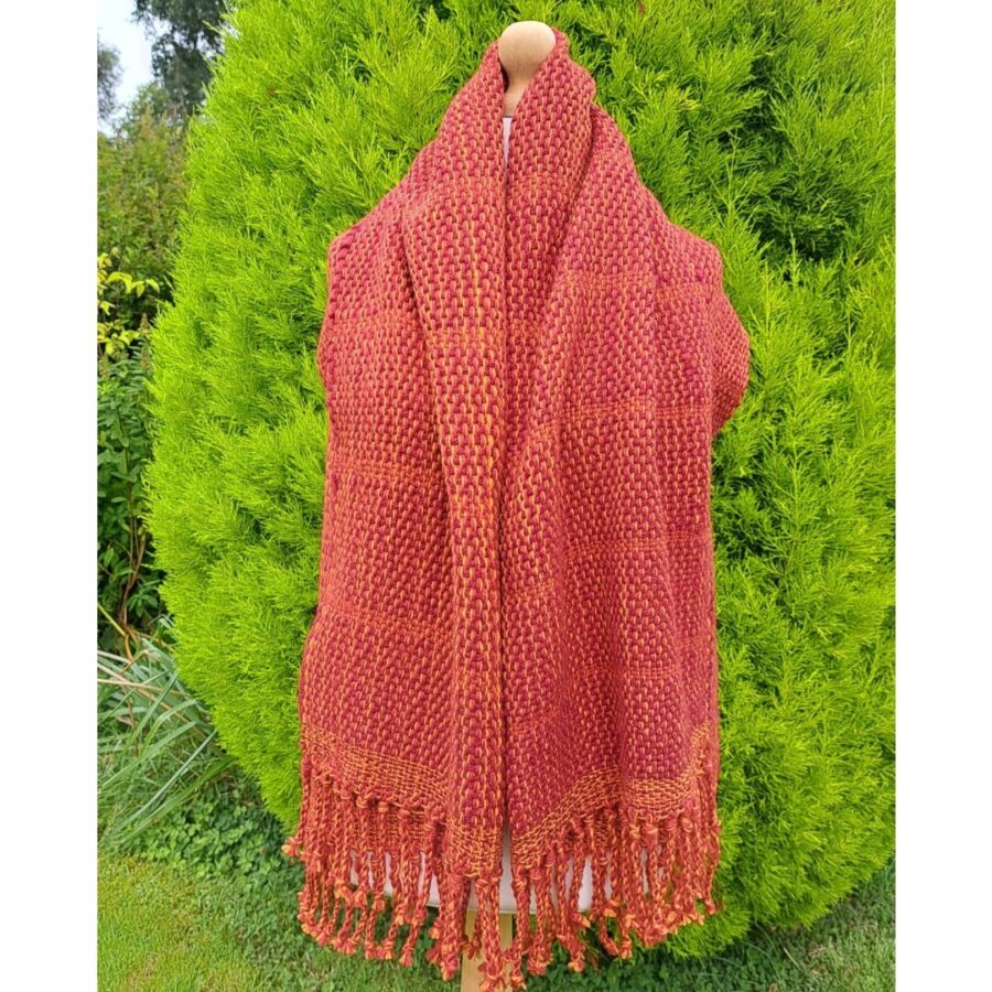 This heavy weight shawl or throw was woven on a rigid heddle loom from wool and rayon yarns in vibrant shades of brick red, tangerine, and burgundy. The tabby weave accentuates the bold colour palette and creates an open yet heavy woven textile. Suitable for use as both a shawl and as a throw this is a versatile piece which will provide warmth. Measuring 59 x 26 1/2 inches, plus double twisted fringe terminals Measuring an additional 4 inches.