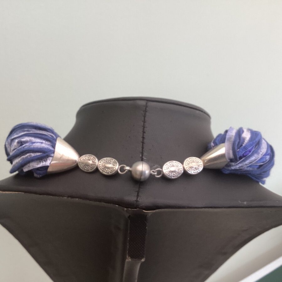 Twisted Scarves are designed to sit softly just below the neckline. Twist by holding the bead caps at the ribbon ends to create the desired length and shape. Open the magnet by holding adjacent beads and gently pull. The magnetic clasps are nickel free. Ideal to wear to compliment any outfit or to match your shoes or handbag etc to complete your desired look. Easy to wear and so suitable for anyone who struggles to fasten necklaces etc due to arthritis or other medical conditions.