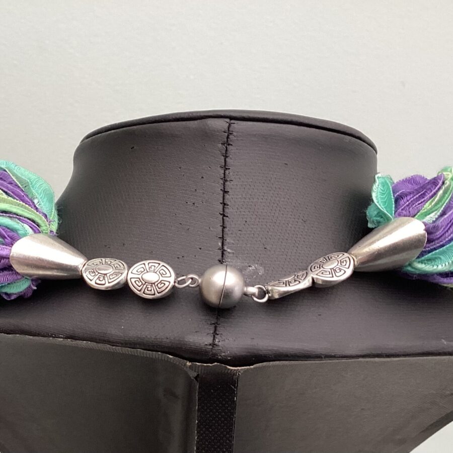 Twisted Scarves are designed to sit softly just below the neckline. Twist by holding the bead caps at the ribbon ends to create the desired length and shape. Open the magnet by holding adjacent beads and gently pull. The magnetic clasps are nickel free. Ideal to wear to compliment any outfit or to match your shoes or handbag etc to complete your desired look. Easy to wear and so suitable for anyone who struggles to fasten necklaces etc due to arthritis or other medical conditions.