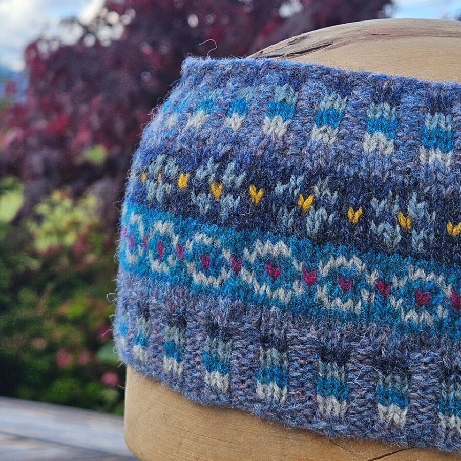 This colourful, hand knitted headband will keep your ears cosy on blustery days. The 'Peerie' design is influenced by the wee patterns that are between the main motifs in Fair Isle knitting. Twilight blue main colour. Medium size but can be knitted to order in any size or colourway. As each item is individually knitted, colours and patterns may vary slightly but the overall impression will be similar.