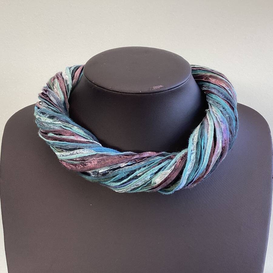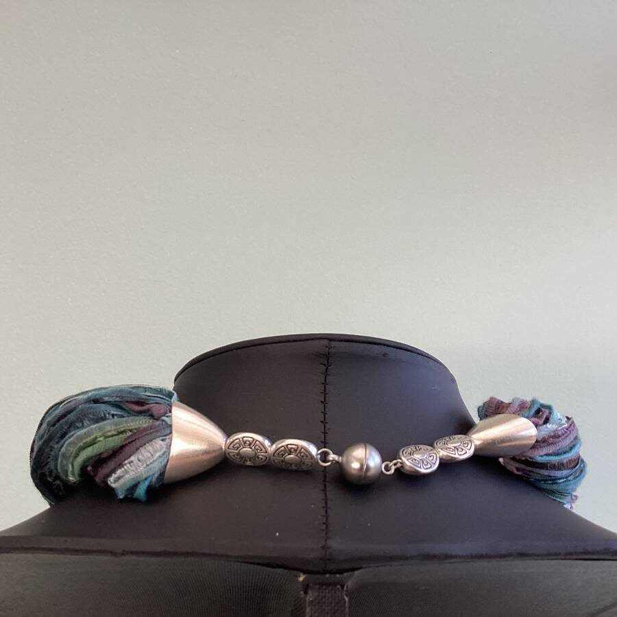 Twisted Scarves are designed to sit softly just below the neckline. Twist by holding the bead caps at the ribbon ends to create the desired length and shape. Open the magnet by holding adjacent beads and gently pull. The magnetic clasps are nickel free. Ideal to wear to compliment any outfit or to match your shoes or handbag etc to complete your desired look. Easy to wear and so suitable for anyone who struggles to fasten necklaces etc due to arthritis or other medical conditions.