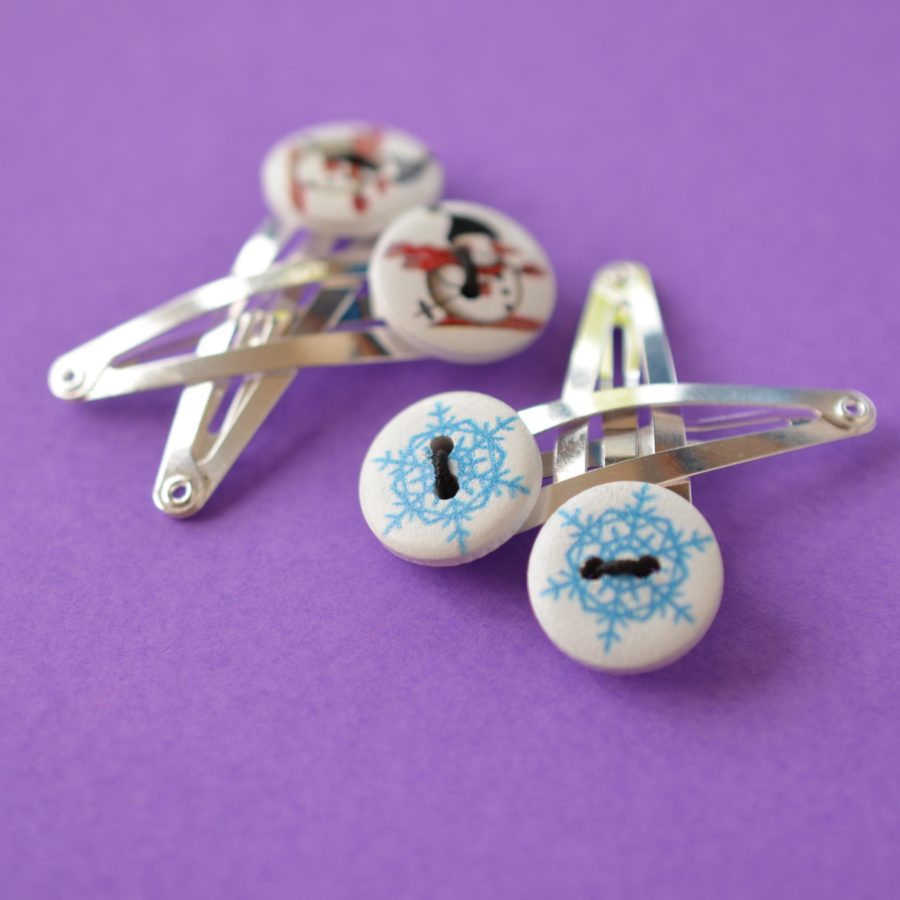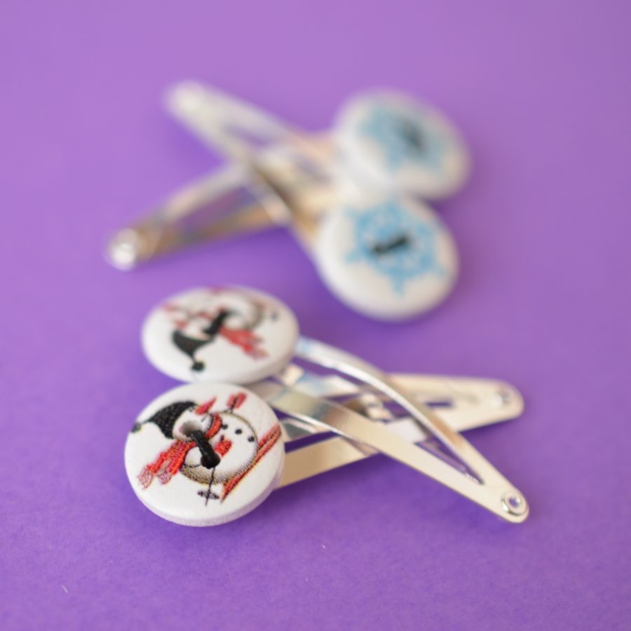 Cute button hair clips. One pair featuring a skiing snowman and one pair with a blue snowflake. 15 mm wooden buttons mounted on a 39mm long silver-plated hair clip. Supplied in gift pouch.