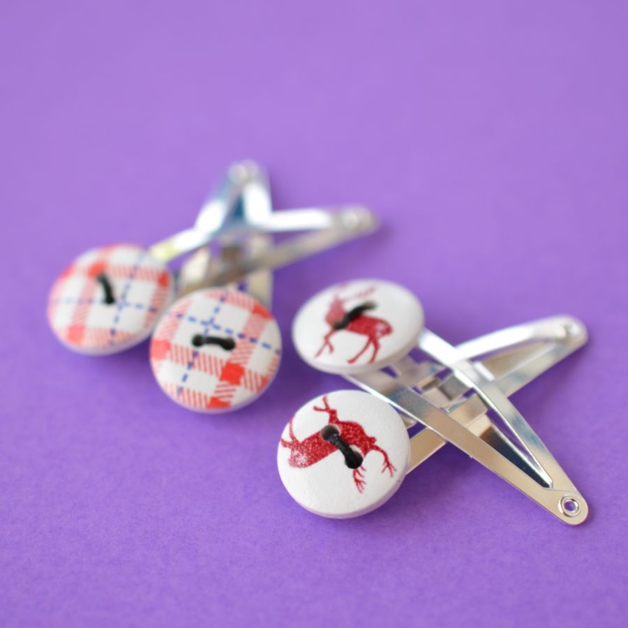 Cute button hair clips. One pair with a red stag/reindeer and one pair in a red, blue and white tartan check. 15 mm wooden buttons mounted on a 39mm long silver-plated hair clip. Supplied in gift pouch.