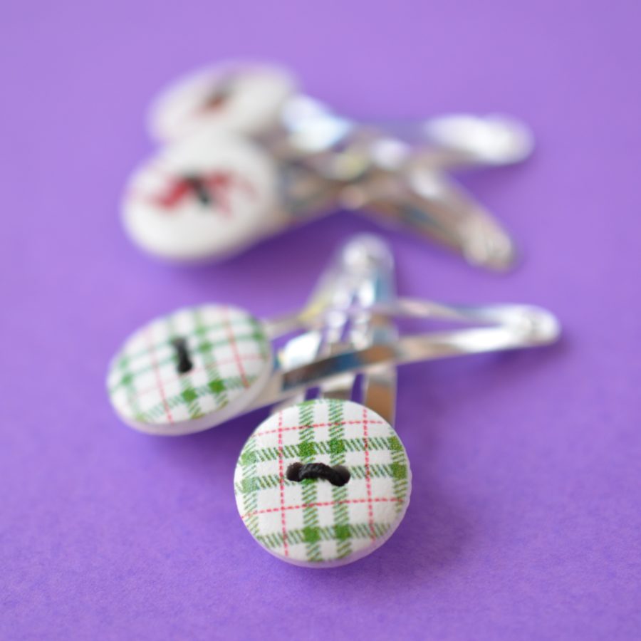 Cute button hair clips. One pair with a red stag/reindeer and one pair in a green, red and white tartan check. 15 mm wooden buttons mounted on a 39mm long silver-plated hair clip. Supplied in gift pouch.